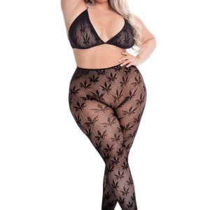 Set of bra and legging. Made of net fabric. Embroidery of hemp leaves. Handwash.A highly-seductive duo. This risqué All About Leaf Bra Set features a bra and footless leggings combo. What makes things truly sultry is the sheer net material that doesn’t leave much to the imagination. Highlighted by a unique pot leaf design, let your personality shine on those occasions where flowers and hearts just won’t do.You can wear it on its own and give your partner a visual treat, or tease them by pairing it with panties of your choice. However you choose to rock this set, you’ll look blazing hot!Comfortable and risqué net materialCheeky pot leaf designAdjustable triangle cups for the top and footless leggings combo