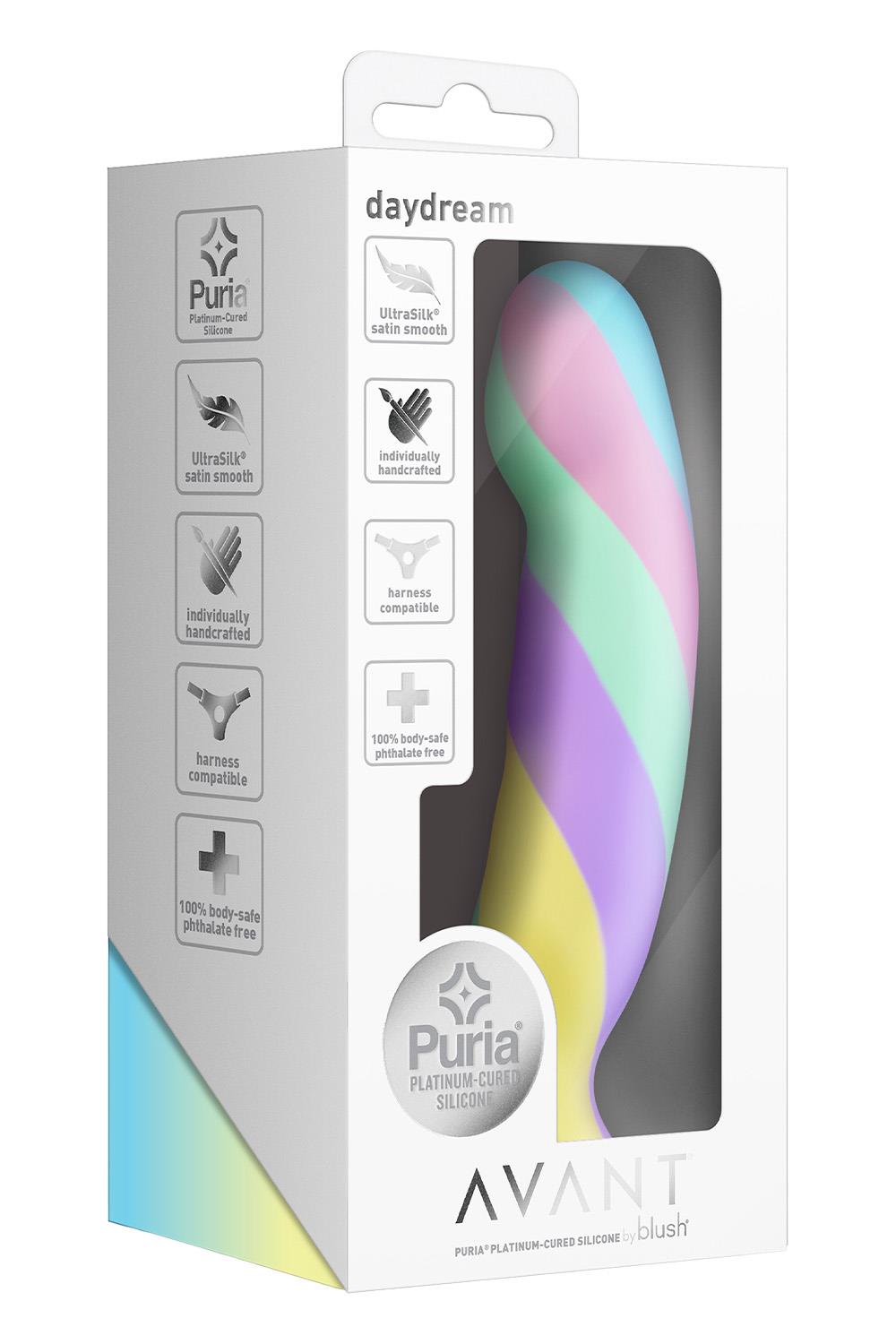 Modern, stylish, and beautiful—meet Avant Daydream. This piece is handcrafted for a truly artisanal feel, giving you a one-of-a-kind toy that reflects both quality and individuality. With soothing pastel hues that inspire relaxation, Daydream features a broad, smooth head expertly shaped to elevate both G-spot and P-spot pleasure with seamless precision. Its gently curved shaft offers comfort and control for a satisfying experience every time. Built for both solo and shared adventures, Daydream is fully harness compatible, opening the door to versatile partnered play and offering the freedom of hands-free exploration. Crafted from Puria®, our premium platinum-cured silicone, and wrapped in an UltraSilk® satin-smooth finish, it feels irresistibly soft against the skin while remaining non-porous, hypoallergenic, and easy to clean. Let Avant Daydream be your invitation to escape into blissful, dreamy delight.Artisanal Handcrafted & Thoughtfully DesignedPuria® Platinum-Cured Silicone, UltraSilk® Satin SmoothHarness Compatible100% Body-Safe, Phthalate-Free & Easy To CleanLength 6.2 inch / 15,7 cmInsertable length 5 inch / 12,7 cmWidth 1.25 inch / 3,2 cmWeight 4.2 oz. / 118 gr