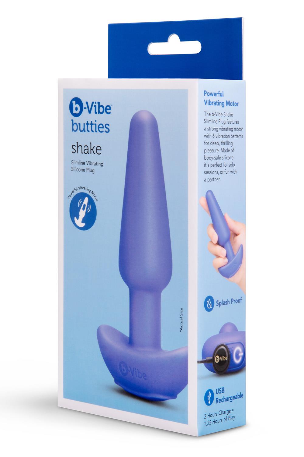 The b-Vibe Shake Slimline Vibrating Silicone Plug features 4 speeds and 6 vibration patterns, diving deep into pleasure. Crafted from premium body-safe silicone, it is the ideal toy for prostate massage, solo enjoyment, or intimate couples play.Slimline Vibrating Silicone PlugPowerful vibrating motorMaterial: Body-Safe Silicone and ABSSex Educator DesignedBody-safe seamless siliconeCompatible with any water-based lubricantUSB rechargeableCharge time: 2 hoursRun time: 1.25 hoursLength: 5.25 inch / 13,4 cmInsertable length: 4.5 inch / 11,5 cmWidth, base: 2.7 inch / 6,9 cmInsertable diameter, min: 0.7 inch / 1,9 cmInsertable diameter, max: 1.3 inch / 3,2 cm