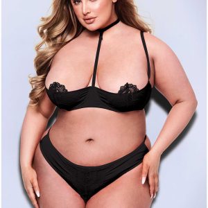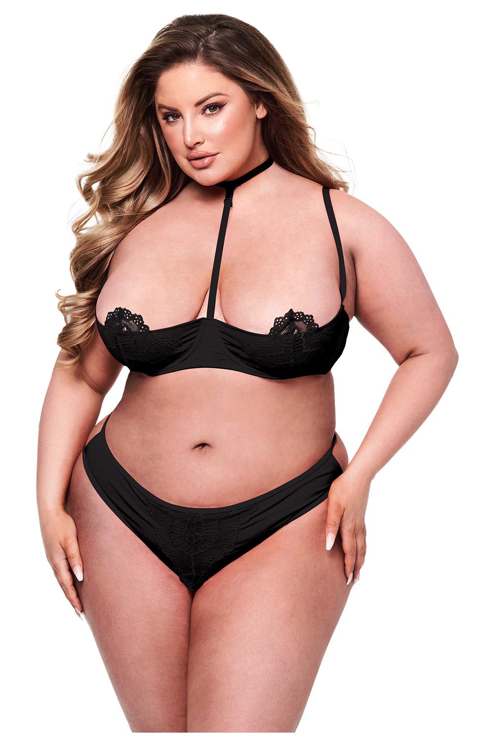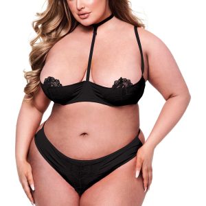 Upgrade a classic look with playful accents with this stunning two-piece set! Designed in classic midnight black, the quarter-cup bra is elevated with sheer, floral lace accents and an adjustable halteresque strap (no need to add an additional necklace!), while the matching g-string looks like a traditional panty in the front, with a dual strapping minimalistic look in the back!Set includes:Quarter Cup BraCrotchless G-String