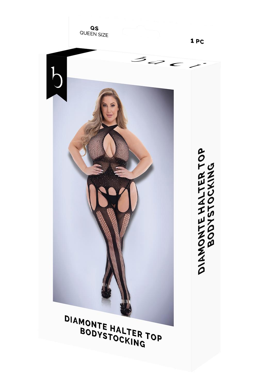 The perfect pair of stockings can tie a look together, but the Diamonte Bodystocking IS the full look! Designed in a luscious, sheer and shimmery midnight black, the criss-cross halter top leaves little to the imagination with a keyhole cutout, accenting each of your perfect curves, while the patterned mesh keeps the look elegant. Open at the hips, garter style straps complete the look with attached stockings, striped in pattern with wide, fishnet-style cutouts.