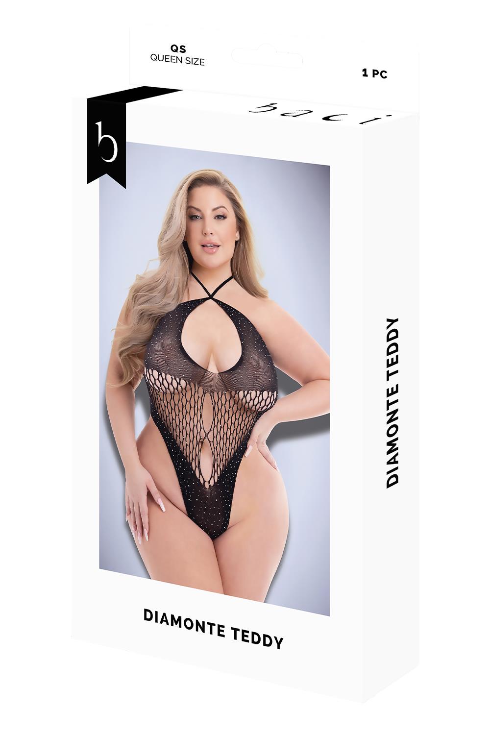 Fabulous and sexy collide when you slip into The Diamonte Teddy by Baci! Available is a sheer and shimmery midnight black, The Diamonte features an adjustable halter neckline with a sinfully sexy keyhole. The fishnet torso, with complimentary cutouts along the front, leads to a minimal thong bottom, cut high on the hips and just as shimmery as the top! Sure to become one of your favorite flirty pieces!