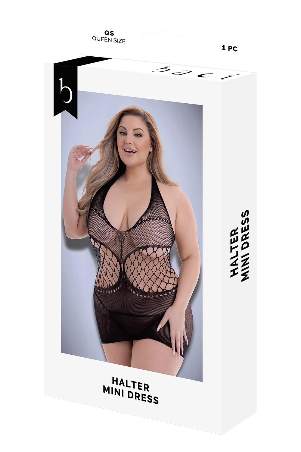 Never has a throwback style been so seductively updated to keep you feeling sleek and sexy! This halter mini dress, designed with a deep-cut halter neck and super-mini cut, has a hint of the 90’s in style, but the sheer, midnight black mesh and symmetrical cutout fishnet updates the look for today!
