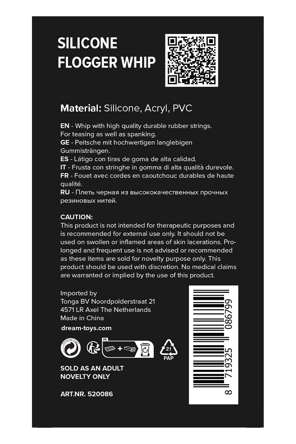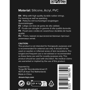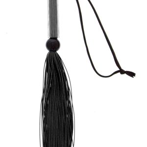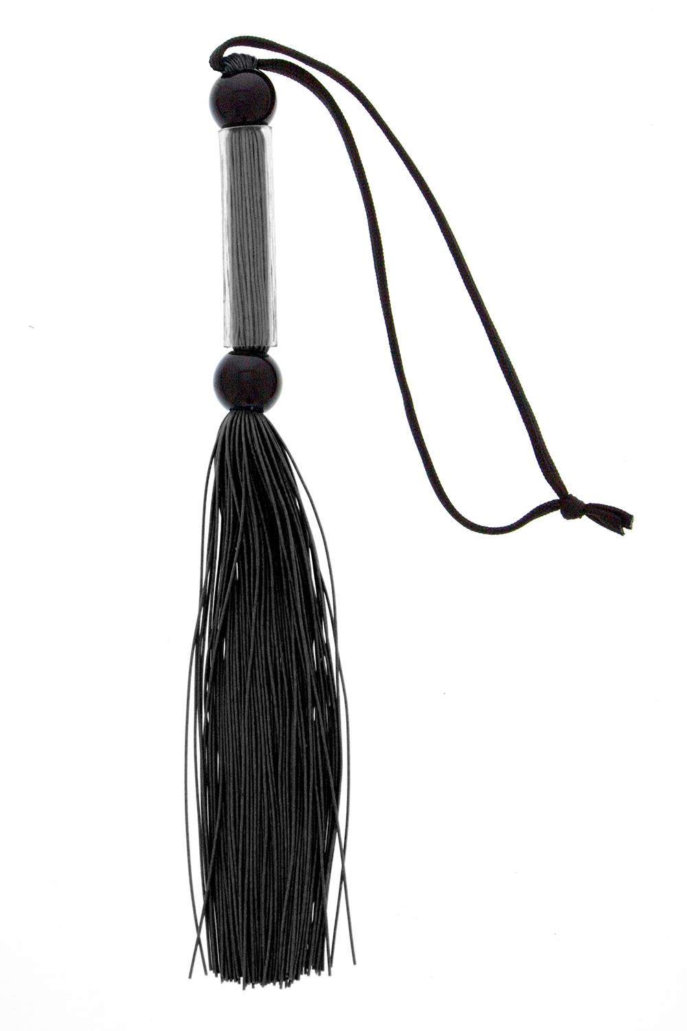Black silicone flogger whip from the Guilty Pleasure BDSM collection.For bondage play or decoration.Length 25.6 cm / 10.1 inch.Silicone tassels.With a wrist loop for holding and storage.This elegant and erotic flogger can be used for teasing, tickling and whipping.