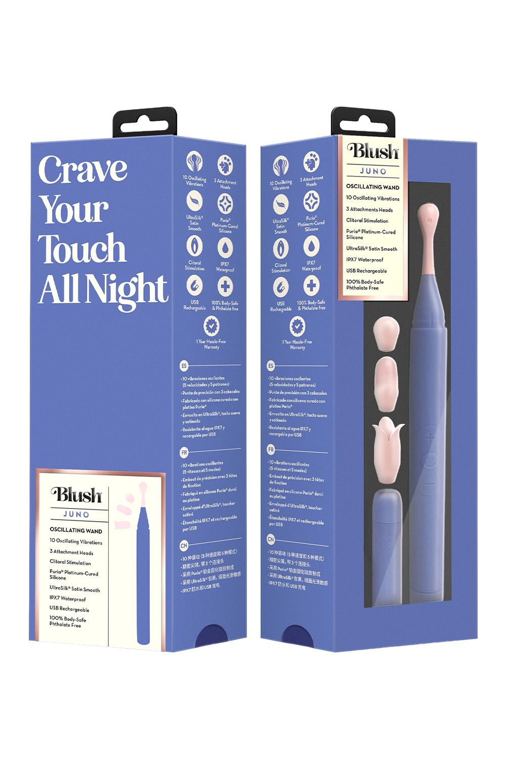 Surrender to the rhythm of pleasure with Juno. This elegant oscillating wand is designed to awaken your senses, delivering deep, rhythmic stimulation through 10 powerful vibration modes. Its precision tip teases and delights exactly where you crave, while three interchangeable attachments unlock new sensations for an experience as unique as you. Crafted with Puria® platinum-cured silicone and wrapped in UltraSilk®, Juno is irresistibly smooth, 100% body-safe, and designed for pure indulgence. Choose your favorite attachment, then glide it over the desired area to add targeted stimulation and explore a variety of unique sensations, solo or with a partner. IPX7 waterproof for limitless exploration and USB charging for effortless pleasure, Juno is your invitation to crave the night, again and again.10 Oscillating Vibrations (5 Speeds & 5 Patterns)Precision Tip With 3 Attachment HeadsCrafted With Puria®, Platinum-Cured SiliconeWrapped In UltraSilk®, Satin Smooth FeelIPX7 Waterproof & USB RechargeableLength 7.8 inch / 19,8 cmWidth 0.65 inch / 1,7 cmWeight 1.6 oz. / 45.36 gr