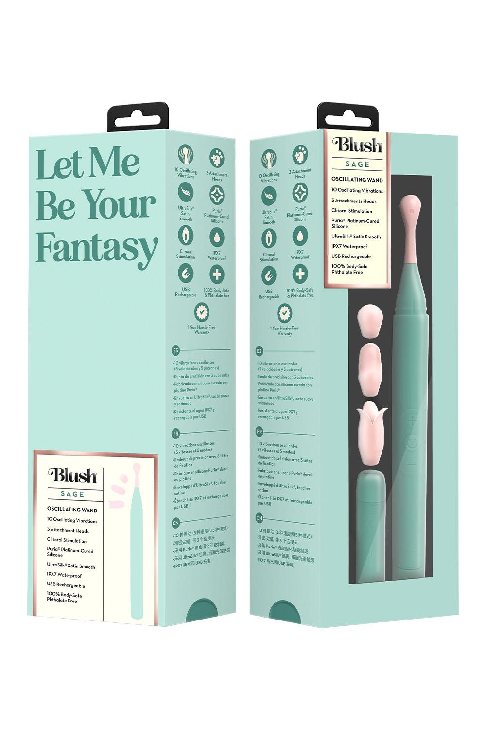 Embrace Sage, your invitation to luxurious pleasure. This elegant oscillating wand is designed to awaken your senses, delivering deep, rhythmic stimulation through 10 powerful vibration modes. Its precision tip focuses on pleasure exactly where you crave it, while three interchangeable attachments offer endless ways to explore. Crafted with Puria® platinum-cured silicone and wrapped in UltraSilk®, Sage is irresistibly smooth, 100% body-safe, and designed for indulgence. Choose your favorite attachment, then glide it over the desired area to add targeted stimulation and explore a variety of unique sensations, solo or with a partner. IPX7 waterproof for limitless exploration and USB charging for effortless pleasure, let Sage take you there, wave after wave.10 Oscillating Vibrations (5 Speeds & 5 Patterns)Precision Tip With 3 Attachment HeadsCrafted With Puria®, Platinum-Cured SiliconeWrapped In UltraSilk®, Satin Smooth FeelIPX7 Waterproof & USB RechargeableLength 7.8 inch / 19,8 cmWidth 0.65 inch / 1,6 cmWeight 1.6 oz. / 45.36 gr