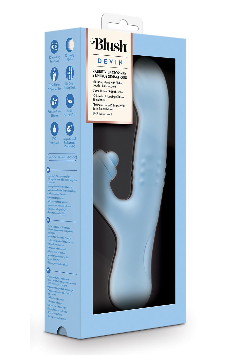 Introducing Devin, the energetic rabbit vibrator that is ready to Give You Everything Tonight! Designed for your satisfaction, this vigorous vibrator offers a world of G-spot & clitoral sensations all at once. Devin’s elegant design features a sliding shaft with massaging beads that gracefully glide up and down through your erogenous zones. The rounded head is curved to contour to your body, with 10 vibration modes and a sensual come-hither stroking motion that romances your G-spot with tantalizing sensations. Enhance your pleasure further with the clitoral massaging ball as it massages your clit gently and passionately, including 3 speeds & 7 unique patterns to choose from. Crafted from body safe platinum-cured silicone, Devin feels satin smooth against your skin, ensuring wonderful touch & comfort during use. With its IPX7 waterproof design and USB magnetic recharging, its ready to accompany you in the shower or bath for enhanced play. Devin is ready to hit all the right spots.10 Vibration modes with massaging beads that slide up and down10 Thumping clitoral stimulationsCome hither G-spot motionCrafted from platinum-cured silicone with a satin smooth feelUSB magnetic rechargeableIPX7 waterproof fully submersibleLength 9.25 inch / 23,5 cmInsertable length 5 inch / 12,7 cmWidth 1.5 inch / 3,8 cmManual: Video Manual