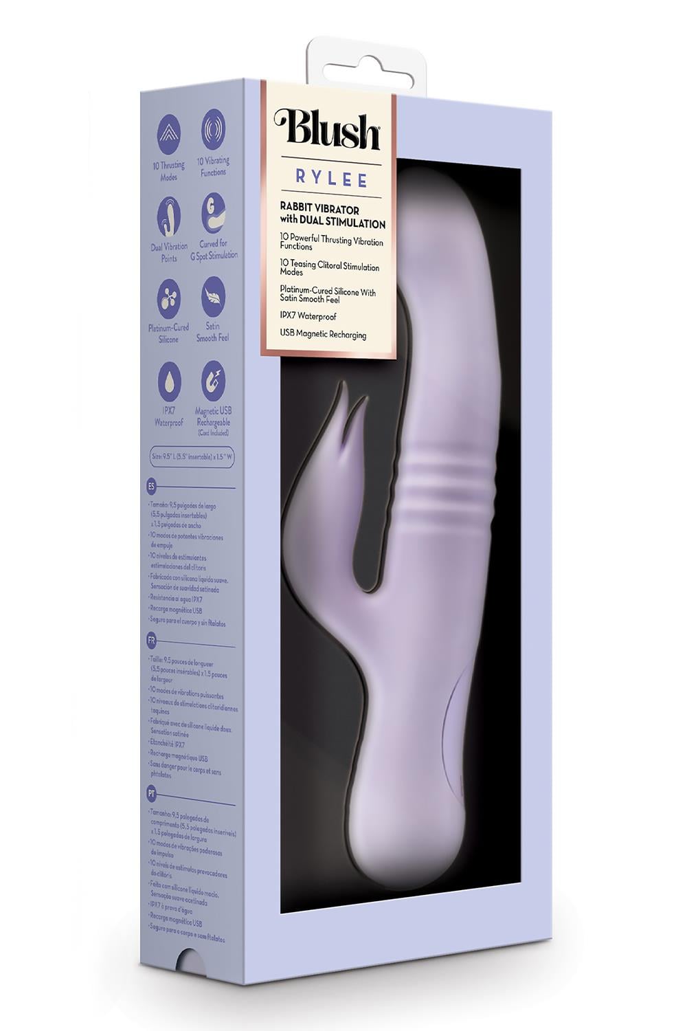 Introducing Rylee, the sleek and energetic rabbit vibrator that will Make The Bed Shake. With its elegant design, this dual stimulator offers a world of clitoral and G-spot sensations. Its rounded head is curved for comfortable insertion, featuring 10 powerful thrusting vibrations, with 3 progressive speeds & 7 creative patterns that passionately romances your G-spot. The clitoral stimulator adds 10 additional discreet vibrations, softly teasing and caressing your clitoris with delicate and tantalizing sensations. Crafted from body safe platinum-cured silicone, Rylee feels satin smooth against your skin, ensuring sensational comfort during use. With its IPX7 waterproof design and USB magnetic recharging, its ready to accompany you in the shower or bath for enhanced play. There are so many ways to inspire your most intimate moments with this massaging vibrator. Rylee is ready to go all the way till sunrise.10 Powerful thrusting vibrations with 3 speeds and 7 patterns10 Teasing clitoral stimulation modes for enhanced pleasureCrafted from platinum-cured silicone with a satin smooth feelUSB magnetic rechargeableIPX7 waterproof, fully submersibleLenght 9.25 inch / 23,5 cmInsertable length 5.25 inch / 13,3 cmWidth 1.5 inch / 3,8 cmManual: Video Manual