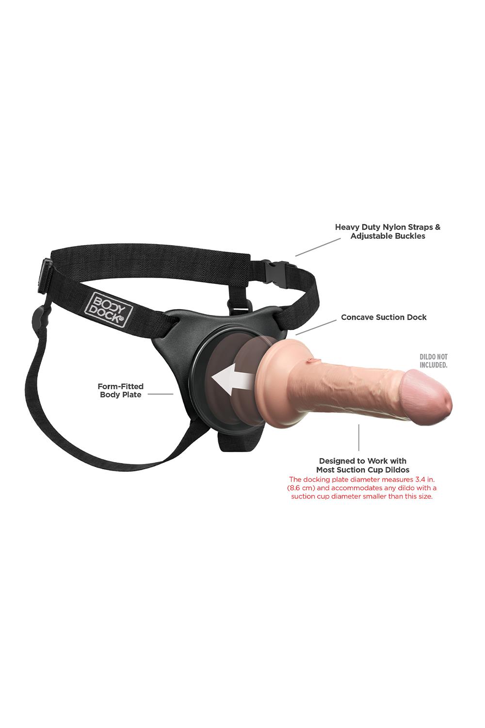 The patented Body Dock® Universal Strap-On Harness System takes strap-on play to a whole new level! It’s as simple as attaching the suction cup on your favorite dildo or vibrator to the docking plate, while the nylon straps easily adjust to fit most sizes and body types. No rings. No snaps. No hassle! Best of all, it works with most dildos on the market today, including some you may already own. Changing your favorite strap-on accessory has never been faster or easier!