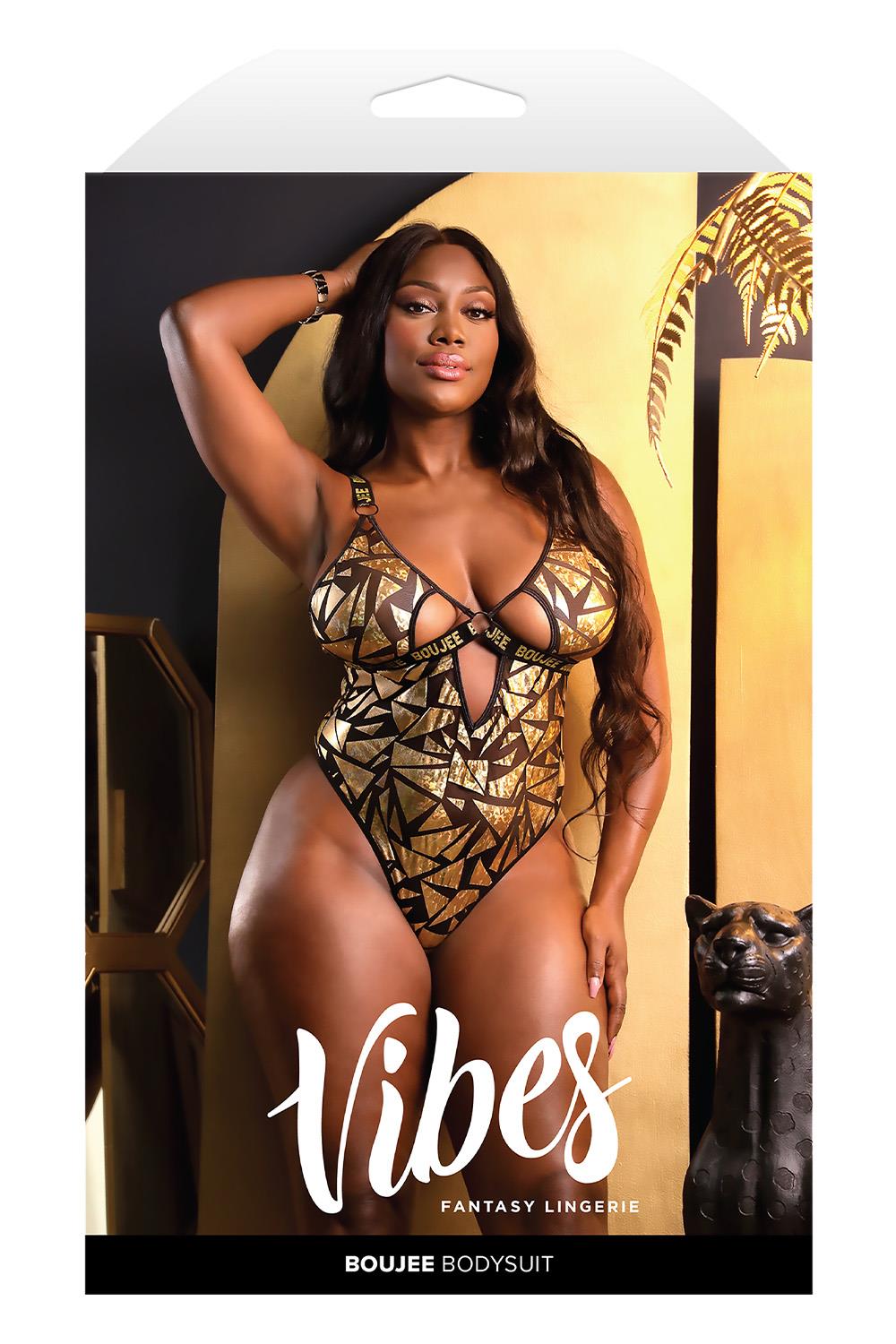 Cut-out shattered foil mesh bodysuit with gold metallic „”Boujee”” elastic and snap closureFabric Content:90% Polyester, 10% SpandexDownload Size Chart Fantasy Lingerie Vibes
