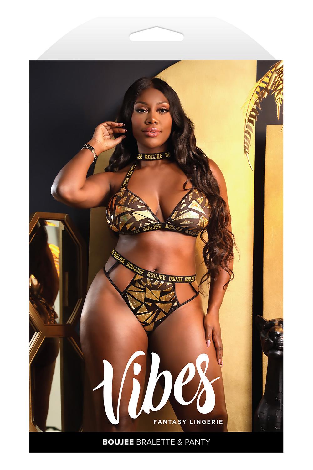 Shattered foil mesh halter bralette and cut-out panty with gold metallic „”Boujee”” elasticFabric Content:90% Polyester, 10% SpandexDownload Size Chart Fantasy Lingerie Vibes