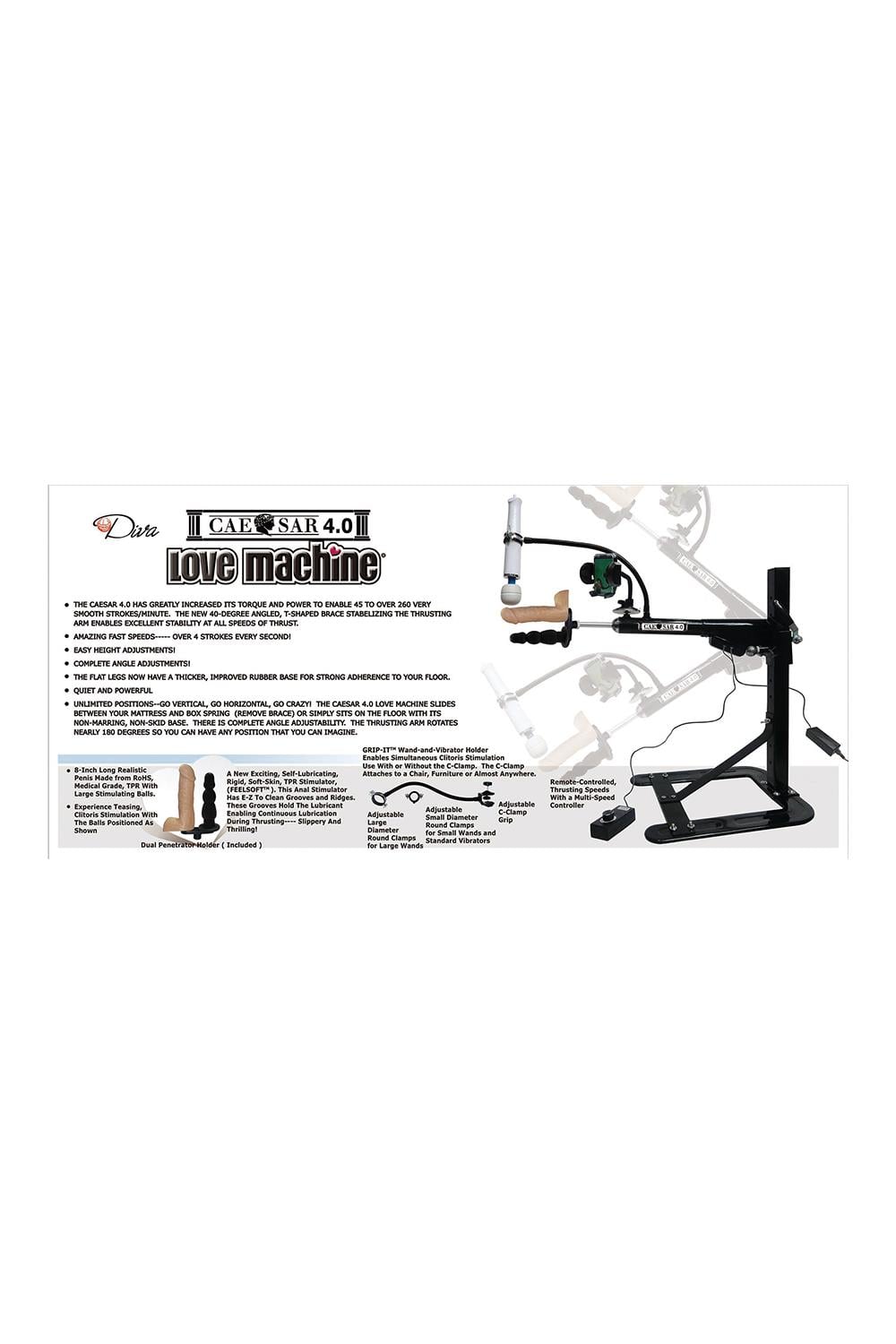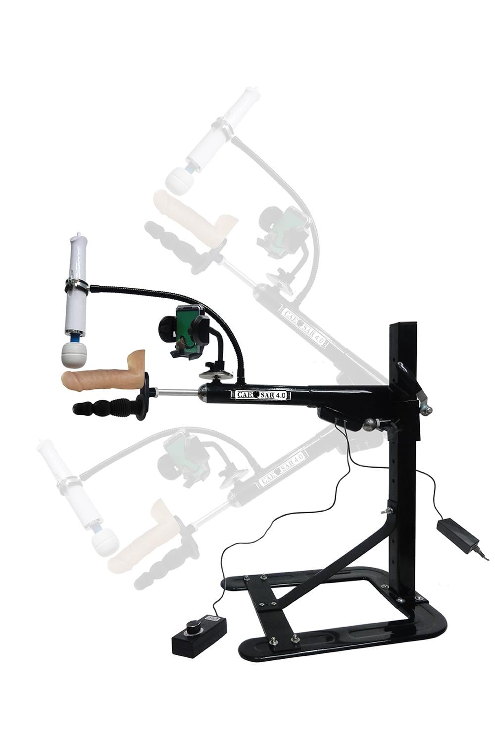 The Caesar 4.0 has greatly increased its torque and power to enable 45 to over 260 very smooth strokes per minuteThe new 40 degree angled, T-shaped braze stabelising the trusting arm enables excellent stability at all speeds of thrustAmazing fast speeds, over 4 speeds every second!Easy height adjustmentsComplete angle adjustmentsThe flat legs now have a thicker, improved rubber base for strong adherence to your floorQuiet and powerfulUnlimited positions: go vertical, go horizontal, go crazy!The Caesar Love Machine slides between your mattress and box spring (remove brace) or simply sits on the floor with its non-marring, non-skid baseThe thrusting arm rotates nearly 180 degrees so you can have any position that you can imagineGrip-It wand-and-vibrator holder enables simultaneous clitoris stimulation, use with or without the C-clampAdjustable large diameter round clamps for large wandsAdjustable small diameter round clamps for small wands and standard vibratorsAdjustable C-clamp grip, C-clamp attaches to a chair, furniture or almost anywhereRemote controlled, thrusting speeds with a multi-speed controllerInput: Either 110/120 Volts (60 Hz) or 220/240 Volts (50 Hz)Output: 24 Volts, 4 AmpsWeight 26 lbs / 11,79 kgThrusting arm height: adjustable from 13 inches (33 cm) to 26 inches (66 cm)Base size: measures 20 inches (50 cm) long by 16 inches (40 cm) wideTotal vertical mast height 27 inches (68 cm)Wand massager not includedAccessories:An 8 inch long, realistically looking-and-feeling penis made from RoHS, medical grade TPR with large stimulating balls easily attaches to the shaft in the thrusting arm for vaginal and clitoral stimulationAn exciting, self-lubricating, rigid, soft skin stimulator made of TPR (Feelsoft TM) attaches to the shaft in the thrusting arm for anal fun. Easy to clean grooves and ridges hold lubricant enabling continuous lubrication during thrusting, slippery and thrillingMobile phone holder for filming and watching the action (phone not included). Multi-functional positioning. Enables filming and watching the action. Transparent frame holds personal photo. Spring activated, cushioned side-grips to safely hold your phone. Swivel base rotates 360 degrees with locking button to aim and lock the mobile phone in the desired position. Silicone suction cup with spring activated snap-lock for extra surface gripping.A flexible-yet-rigid gooseneck with an adjustable C-clamp, and also adjustable round clamps to fix rigidly to almost any wand or vibrator enables thrilling stimulation to the pubic area and the clitorisAn easy turning dial for adjusting the speed of the thrusting arm from 45 to over 260 rpmA dual penetrator-holder included for enabling simultaneous stimulation to the anal and vaginal areas. Try different shapes and sizes of dildos for more excitement. Fits all Vacuum-Lock TM and Vacuum-Grip TM dildos.Unlimited positions:Go vertical, go horizontal, go crazy! Simply place the Caesar 4.0 love machine on the floor with its non-marring, non-skid base or slide it between your mattress and box spring for fun usage in the bed. Remove the 40 degree angle stabilizer to slide the Caesar 4.0 beneath the mattress. There is complete angle adjustability, the thrusting arm rotates nearly 180 degrees so you can have any position that you can imagine. Quiet and powerful:The flat, wide legs have a thick rubber base for strong adherence to the floor or mattress. The motor operates at a safe, low voltage and contains a powerful gear system to maximize your pleasure. New stability structure:Enjoy Caesar 4.0 with its new T-shaped, angled brace achieving an extremely stable and steady love machine during thrusting at all speeds.