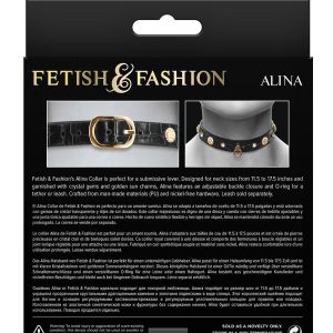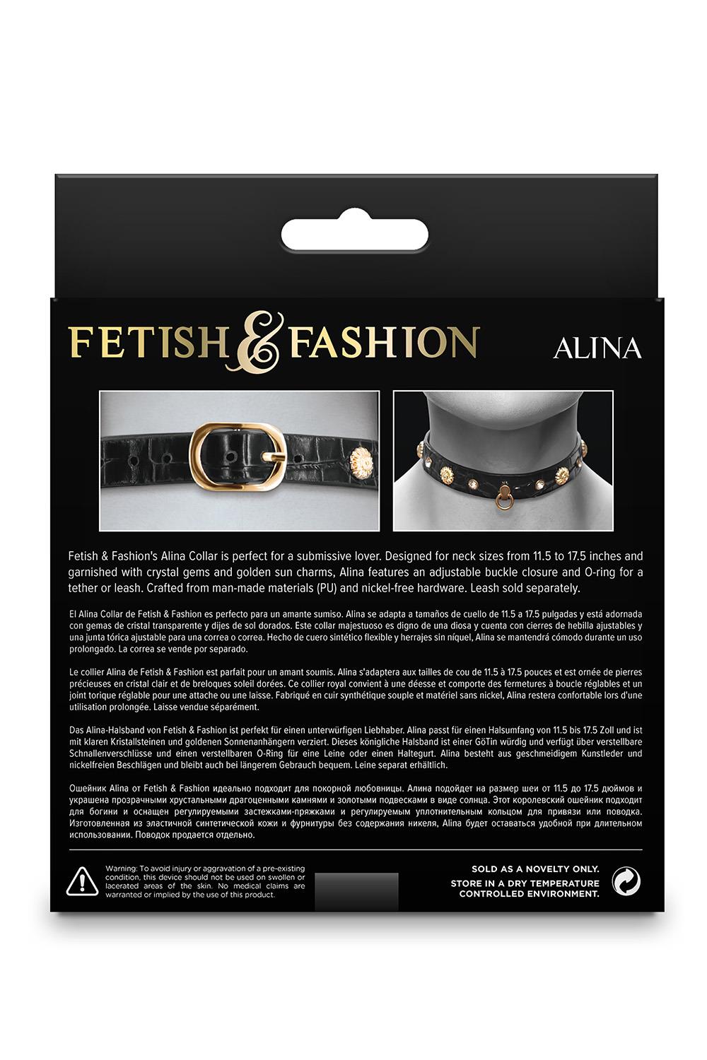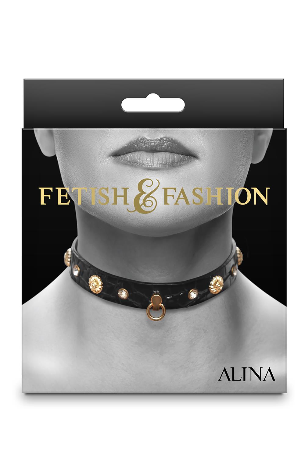 Obroża Alina firmy Fetish & Fashion jest idealna dla uległej kochanki. Zaprojektowana na szyję o obwodzie od 11,5 do 17,5 cala i ozdobiona kryształowymi klejnotami i złotymi wisiorkami, Alina ma regulowane zapięcie na klamrę i o-ring do uwiązania lub smyczy. Wykonane z materiałów sztucznych (PU) i elementów niezawierających niklu.
