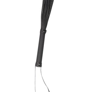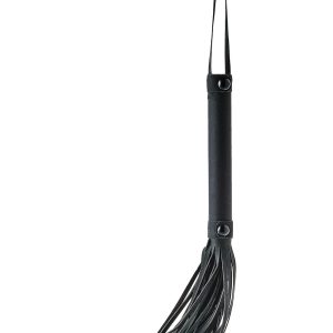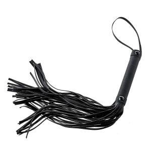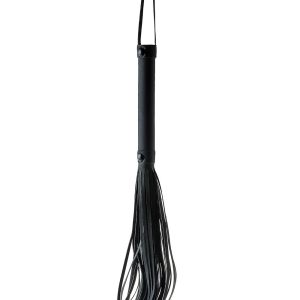 Flogger ze skórzanymi sznurkami o długości 24 cm. Wygodna rękojeść wykonana z tego samego czarnego materiału z wygodnym sznurkiem na nadgarstek.