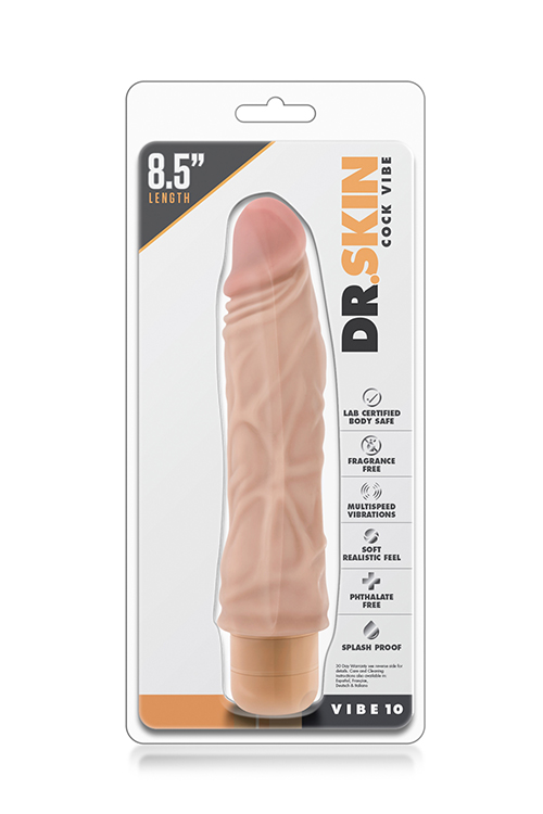 The doctor is in! Dr. Skin Cock Vibe 10 is a realistic vibrating dong with a veiny, textured shaft that erotically massages as you thrust. The powerful, throbbing vibrations are controlled by a convenient, high-to-low twist-dial base. It’s waterproof for shower and bath time. Vibe 10 is made of non-porous and body safe PVC that contains no phthalates, latex, paraffins, or chemical fragrances. To clean, use soap and water or a toy cleaner, then let air-dry.Powerful vibrations, multiple adjustable speed settings conveniently controlled by a twist of the dial Sculpted and formed to look and feel just like a real penisThe soft smooth shaft is flexible, bending to conform to your bodyRated IPX6 water resistant, allowing you to thoroughly and conveniently clean your product under running waterLength 8.5 inch / 21,6 cmInsertable length 7.5 inch / 19 cmWidth 1.75 inch / 4,4 cm