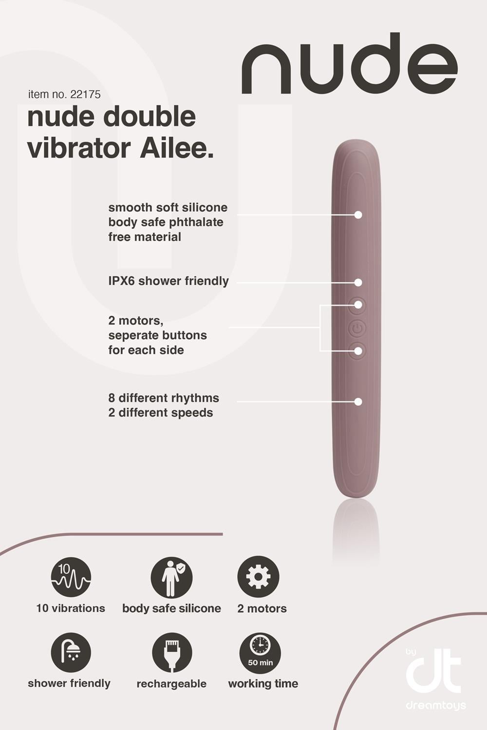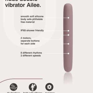Przedstawiamy Ailee by Nude – zwiększ przyjemność, razem lub solo! Odkryj wszechstronność Ailee, elastycznego podwójnego wibratora zaprojektowanego, aby rozpalać pragnienia użytkowników. Wykonany starannie z miękkiego silikonu i ABS, Ailee może pochwalić się dwiema niezależnie działającymi stronami, każda z 10 mocnymi wibracjami – 8 rytmicznymi wzorami i 2 prędkościami.