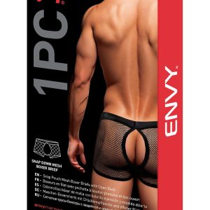 The Envy Menswear Snap Pouch Mesh Boxer Briefs in black are a bold and provocative addition to the world of men’s underwear. Crafted from a breathable mesh fabric, these boxer briefs feature a unique design with an open back, adding an element of daring sensuality. The highlight of these boxer briefs is the strategically placed snap pouch at the front, secured with a single snap closure. This innovative feature allows for a teasing and playful reveal, offering a tantalizing glimpse of what lies underneath.