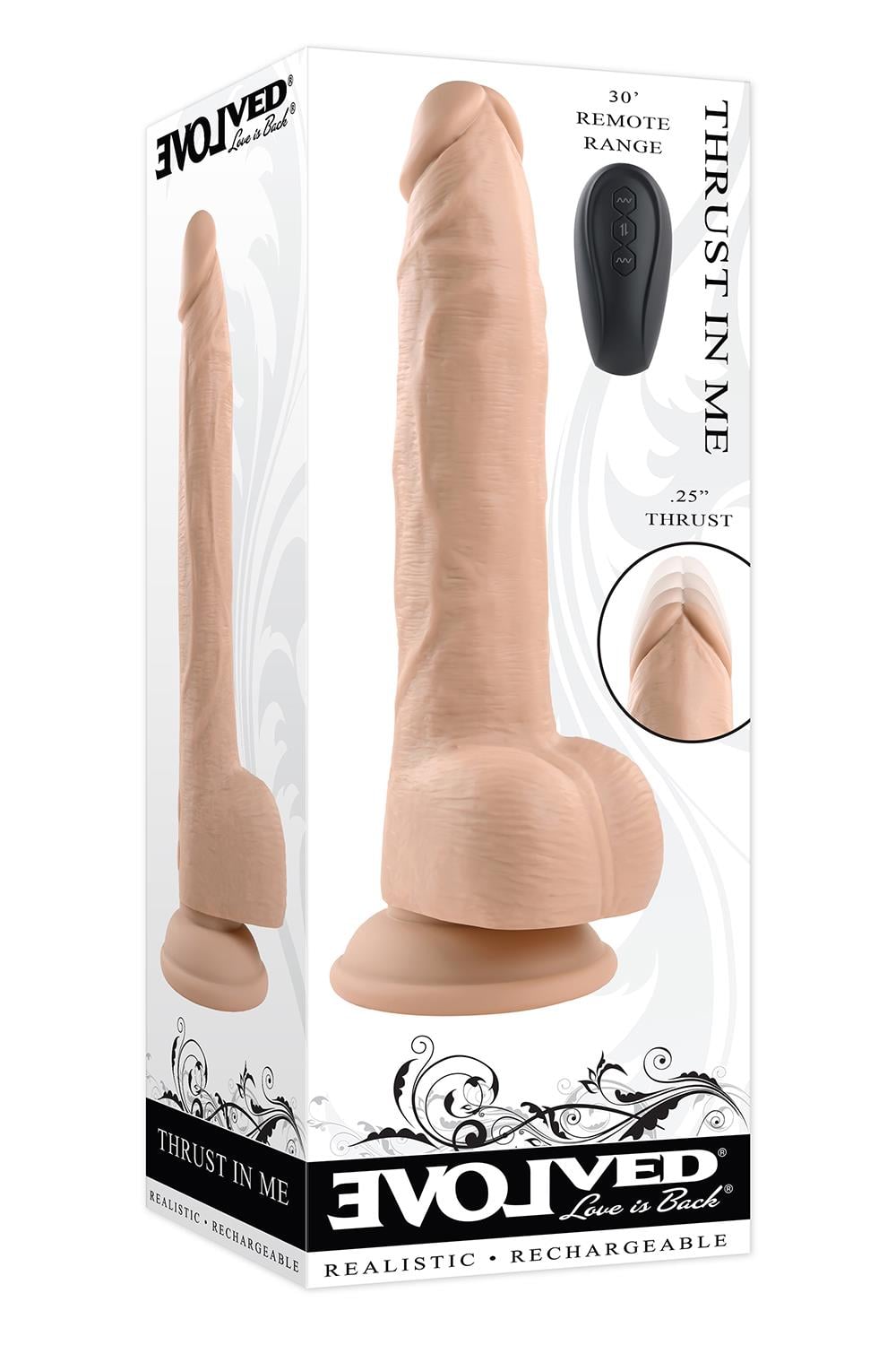 This super-realistic thrusting vibrator has life-like textures from tip to balls with a powerful suction cup base and remote control. Made from 100% silky-smooth silicone, the girthy shaft features 10 speeds and patterns of vibration and the tip thrusts at 3 different tempos, each motor controlled separately. Fully water submersible, rechargeable & easy to clean.Realistic thrusting vibratorLife-like textured shaft & balls2 motors controlled separately10 vibrating speeds & patterns3 thrusting speeds0.25 inch / 0,63 cm thrustMade from silky smooth siliconeRemote made from ABS plasticLED lights up button when in useInsertable length 6.5 inch / 16,5 cmInsertable diameter 1.55 inch / 3,9 cmRemote range 30’ / 9 metersWaterproof & submersiblePhthalate & latex freeUSB rechargeable, cable includedRemote uses 1 AAA battery, includedToy Dimensions: Height: 9.25 inch / 23,5 cmDepth: 2.84 inch / 7,2 cmWidth: 2.91 inch / 7,4 cmRemote Dimensions:Height: 2.96 inch / 7,5 cmDepth: 0.91 inch / 2,3 cmWidth: 1.44 inch / 3,6 cm