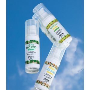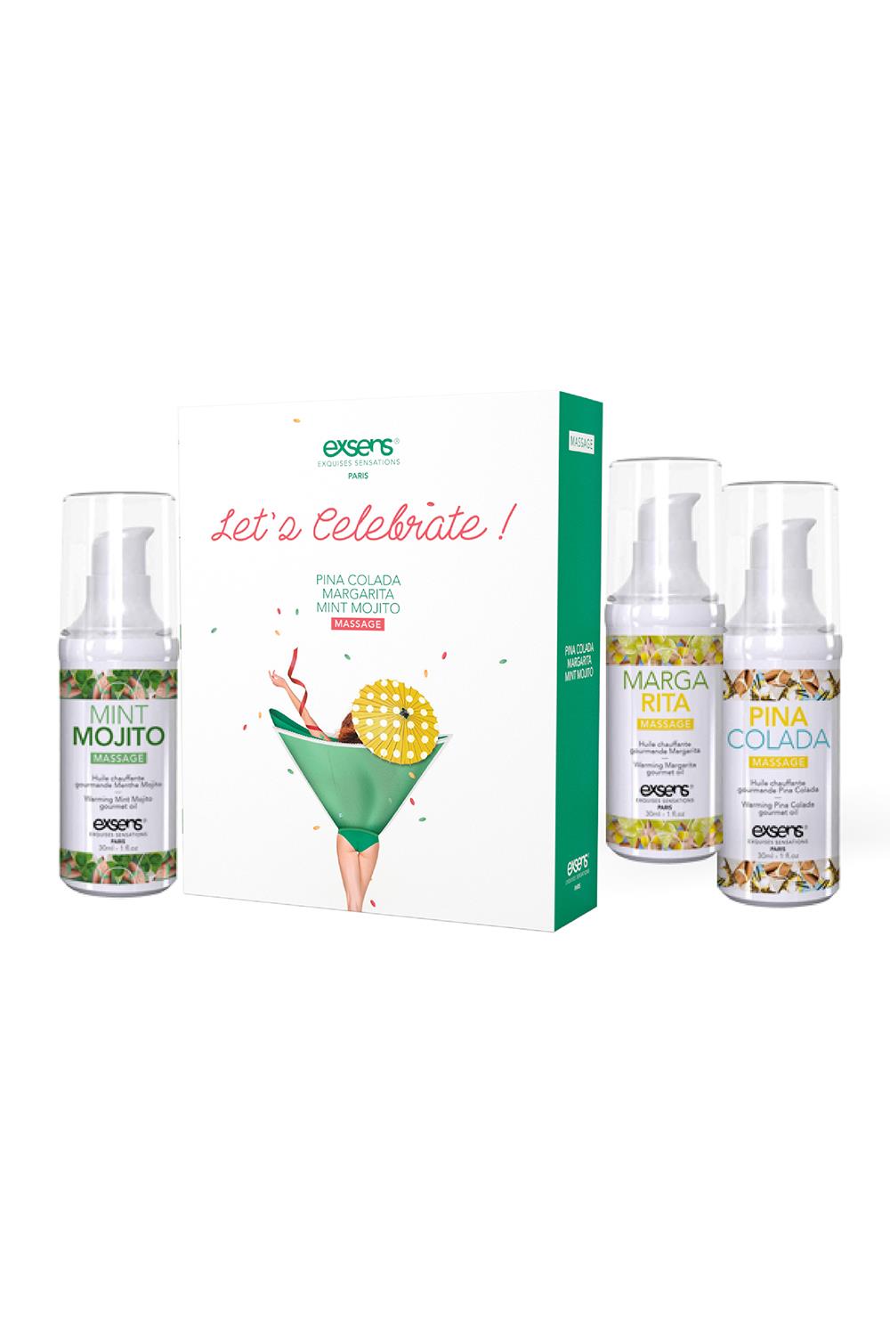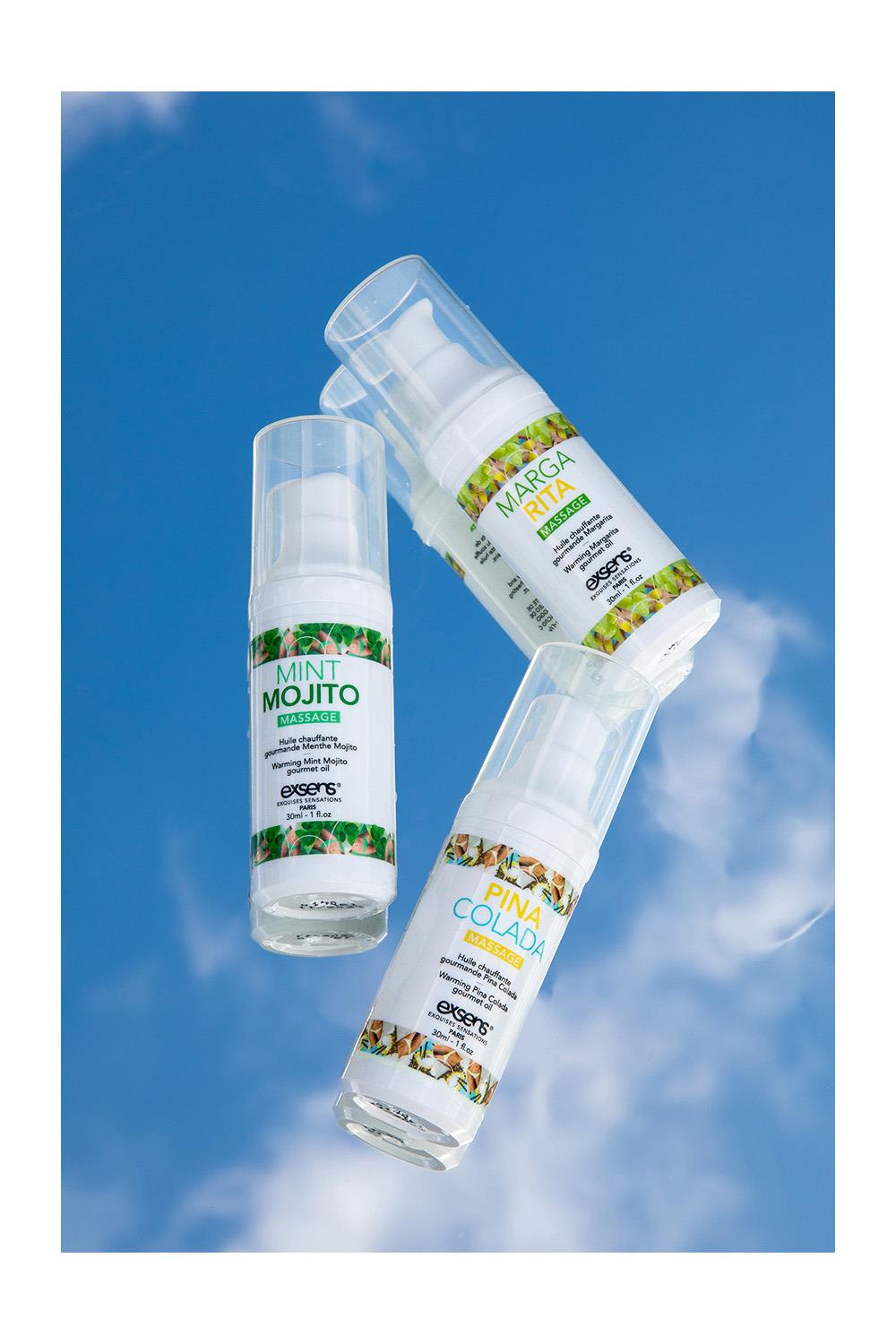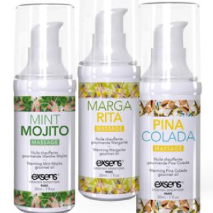 Make cocktail hour all about you! This warming gourmet massage gel is ideal for foreplay. When applied to intimate areas,the gentle warming sensation and kissable flavor encourages touching and oral pleasures.Gentle warming sensationDelicious fruity flavorSugar freeTravel sizedNonstainingNo bitter aftertasteVeganGlow in the dark labelMint mojito, Pina Colada and Margarita flavorsingredients: glycerin, propylene glycol, aroma (flavor), sodium saccharinThe Gourmet line – warming massageIn the Gourmet product line from Exsens you’ll find warming massage oils with delicious flavours that are made with food flavouring. The oils are made of 100% vegetable ingredients and sweetened with Stevia. The oils make enjoying sensuality easy with their gentle warming sensation. They’re silky smooth, never sticky, non-staining and have no bitter aftertaste. Vegan for peace of mind too! For ease of use the labels glow in the dark. No need to put on blinding lights that ruin romantic moments to find the bottle of oil! In addition to the 50 ml bottles, Exsens also offers two gift sets that each contain 3 30 ml bottles of massage oil. “Let’s celebrate!” contains Mojito Mint, Pina Colada and Margarita. The other kit is “Let’s travel!” which offers Strawberry, Hot Vanilla and Coconut.