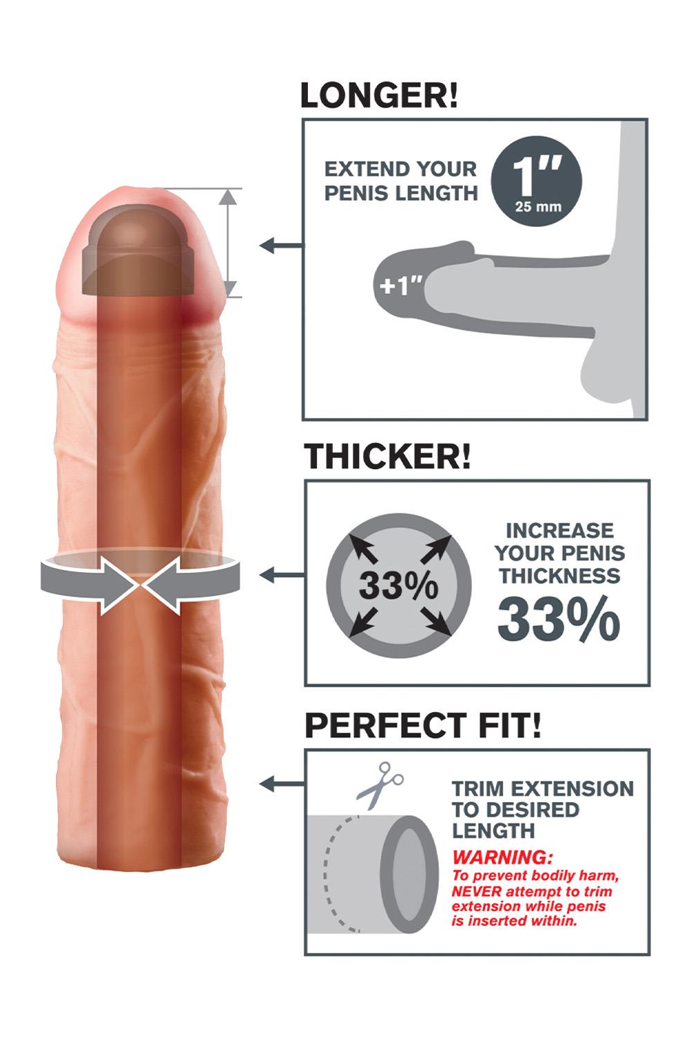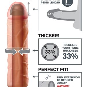 The Perfect 1 in. Extension is a customizable extension that can be easily trimmed at the base for a perfect fit. It’s super-stretchy to accommodate most sizes and snug enough to help you last longer. Your partner will enjoy deeper penetration with the 1 in. extension at the tip, while the ultra-lifelike shaft makes you 33% thicker to offer a fuller feeling and exceptional climax. The super-soft Fanta Flesh® material feels like a second skin. Perfect for men with ED and midway performance problems.