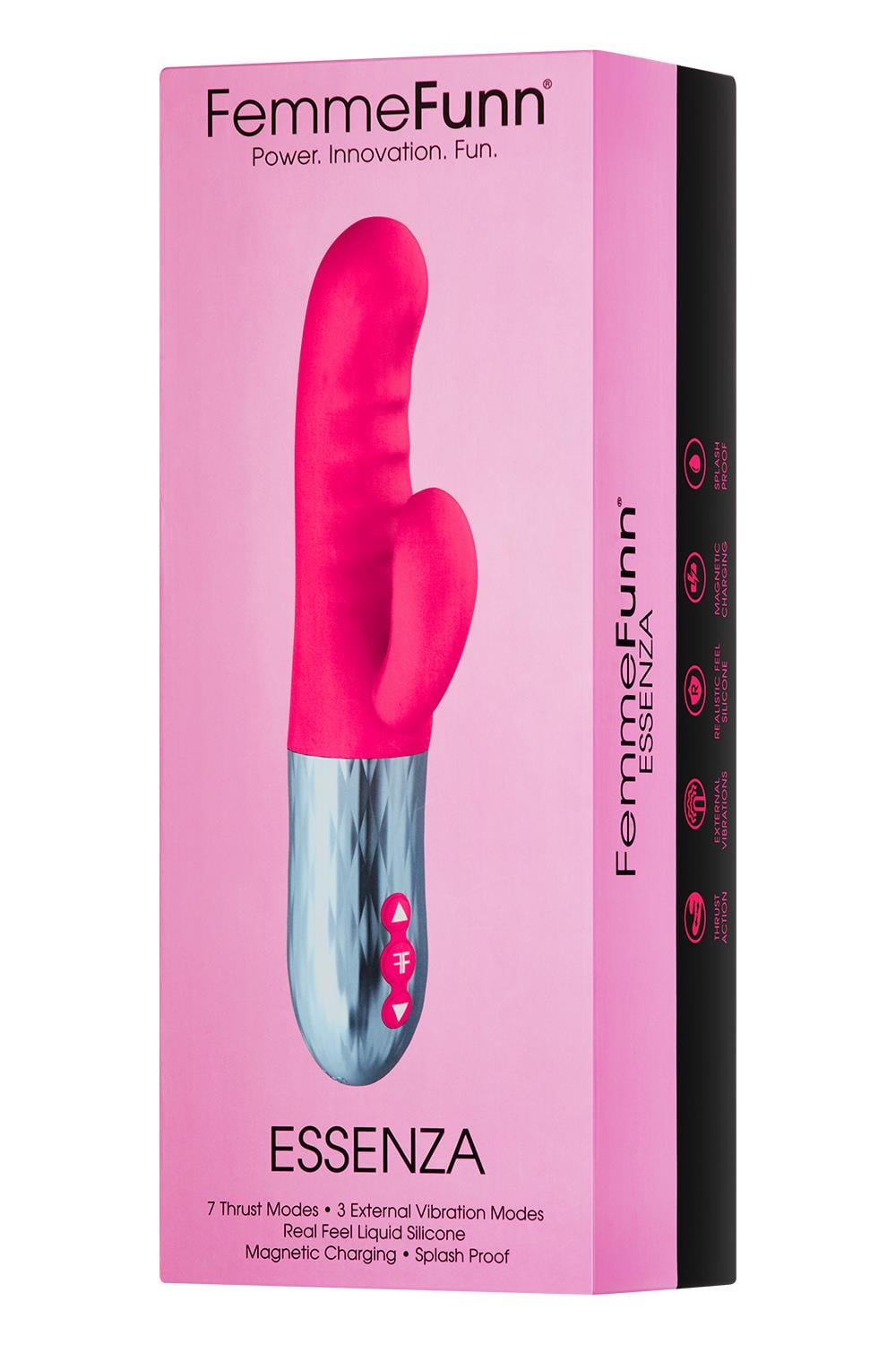Dual Stimulation Rabbit Thrusting VibratorEssenza is our most powerful pleasure tool. The unique thrusting motion allows you to explore your deepest pleasure points, while the powerful vibrations add external stimulation, blending two sensations for double satisfaction.Our proprietary motor gives you the flexibility to control the deep and satisfying thrust modes. Start off slow and build your way up to the highest level of intensity. Add in the 3 external vibrations and reach new levels of dual stimulation.Essenza’s innovation lies in the technology and materials. Our patented thrusting vibrator mechanism creates real-feel motion with unparalleled power. The soft liquid silicone is body-safe, easy to clean, and smoothly transmits the vibrations.The curved shape of Essenza allows you to direct the thrusts at your G-spot. Ready to step up the sensation? Power on the rabbit and feel the vibrations inside and out. Used solo or with a partner, this toy is sure to please.Length: 9.6 inches / 24,4 cmWidth: 1.3 inches / 3,3 cmInsertable Length: 4.3 inches / 10,9 cm3 Vibration modes7 Thrust speedsLiquid SiliconeSculpted G-spot stimulatorApprox. 1/2 inch of thrust expansion100% SplashproofMagnetic chargingMaterial: Liquid Silicone, ABS PlasticBattery: Li-ionCharging Voltage: 7.4VRun Time: Approx. 50 Minutes at Highest Setting*Charge Time: Approx. 4 Hours**Charging and use times are estimates only.Battery life varies over time, and all batteries experience a decline in useful life over time.