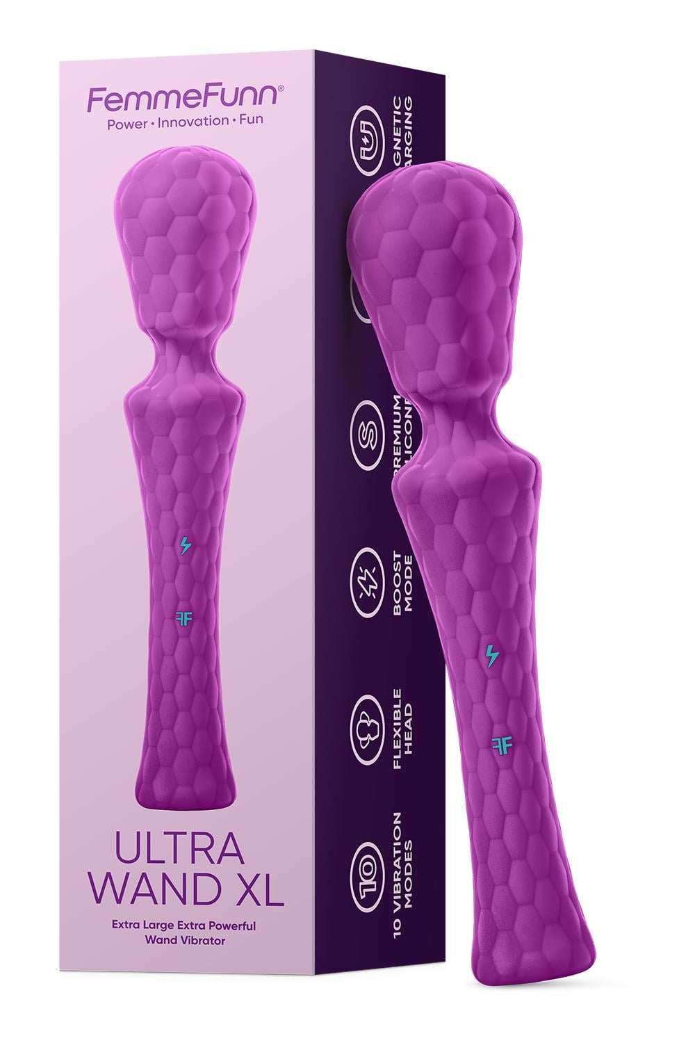 Extra Large Personal Massager Wand VibratorFor anyone who feels that bigger is better. Ultra Wand XL brings extra power to your pursuits of pleasure along with your pick of vibration modes, a flexible head, ergonomic handle for comfort, and an orgasmic boost function with the press of a button.Size matters. The proprietary motor takes every sensation to another level, with 10 vibration speeds and patterns. When you’re ready for more, use the boost function and enjoy an explosive finish.Made from our exclusive SOFTFEEL™ silicone, this 100% waterproof personal massager wand features a silky smooth feel and hexagonal texture that delights every spot it touches plus magnetic USB charging for easy power.Whether you want steady vibrations, patterns that keep you guessing, or the concentrated thrill of our boost mode, this extra large powerhouse delivers. Warning: You’ll want to come back for more.Length: 11.4 inches / 29 cmWidth (Head): 2.45 inches / 6,2 cmWidth (Base): 1.75 inches / 4,4 cm10 Vibration modesBoost function100% WaterproofMaterial: Premium SiliconeBattery: Li-ionCharging Voltage: 5VRun Time: Approx. 100 Minutes at Highest Setting*Charge Time: Approx. 1 Hour**Charging and use times are estimates only. Battery life varies over time, and all batteries experience a decline in useful life over time.