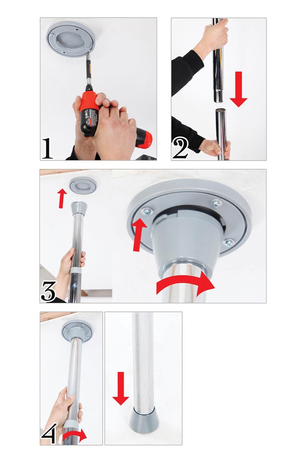 ASSEMBLY INSTRUCTIONS: The heavy-duty, stainless steel pole is easy to install and assembles in minutes. The only tools necessary for installation are a ladder, a power drill or screwdriver, and a stud finder. The Fantasy Dance Pole was designed to install in virtually any flat ceiling and uses a sturdy bolt-in mount. Vaulted ceilings, acoustic ceilings, and false ceilings aren’t recommended. Always check the durability of both the floor and the ceiling prior to installation to ensure sturdiness and safety. If you aren’t sure about installing the pole yourself, contact a qualified handyman to ensure proper installation.