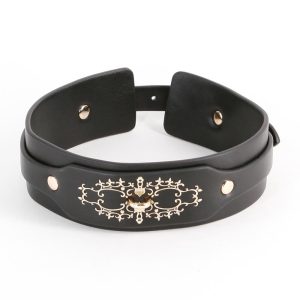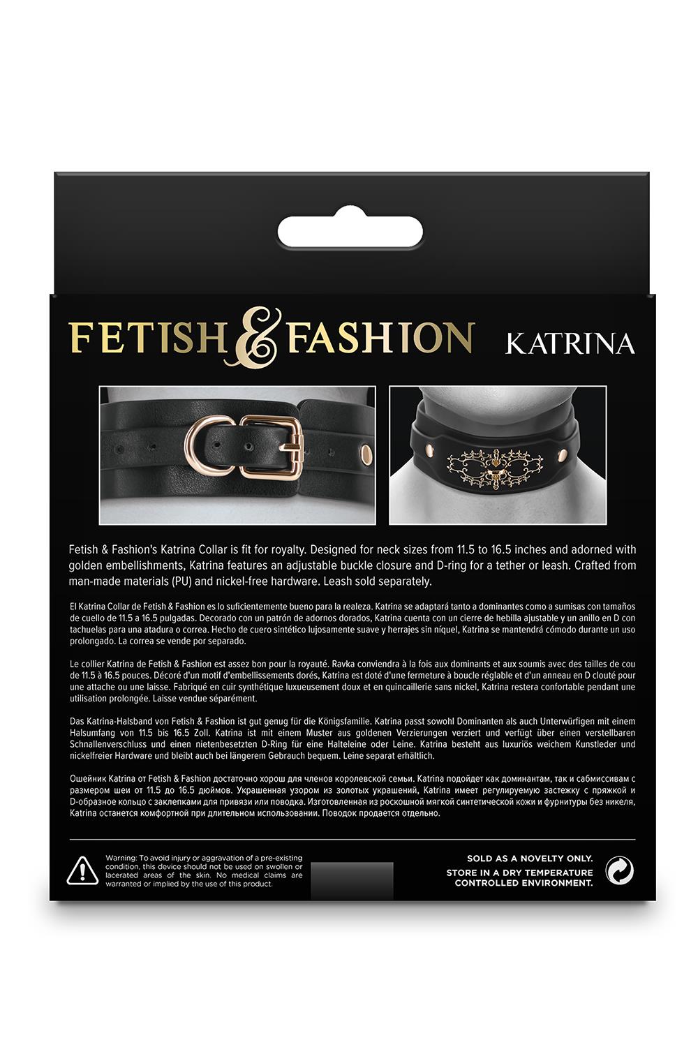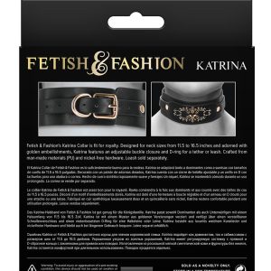 Fetish & Fashion’s Katrina Collar is fit for royalty. Designed for neck sizes from 11.5 to 16.5 inches and adorned with golden embellishments, Katrina features an adjustable buckle closure and D-ring for a tether or leash. Crafted from man-made materials (PU) and nickel-free hardware. Leash sold separately.Made of PU and nickel-free zinc-alloyPhthalate freeFor neck sizes from 11.5 – 16.5 inch / 29,2 – 41,9 cmAdjustable buckle closureD-ring