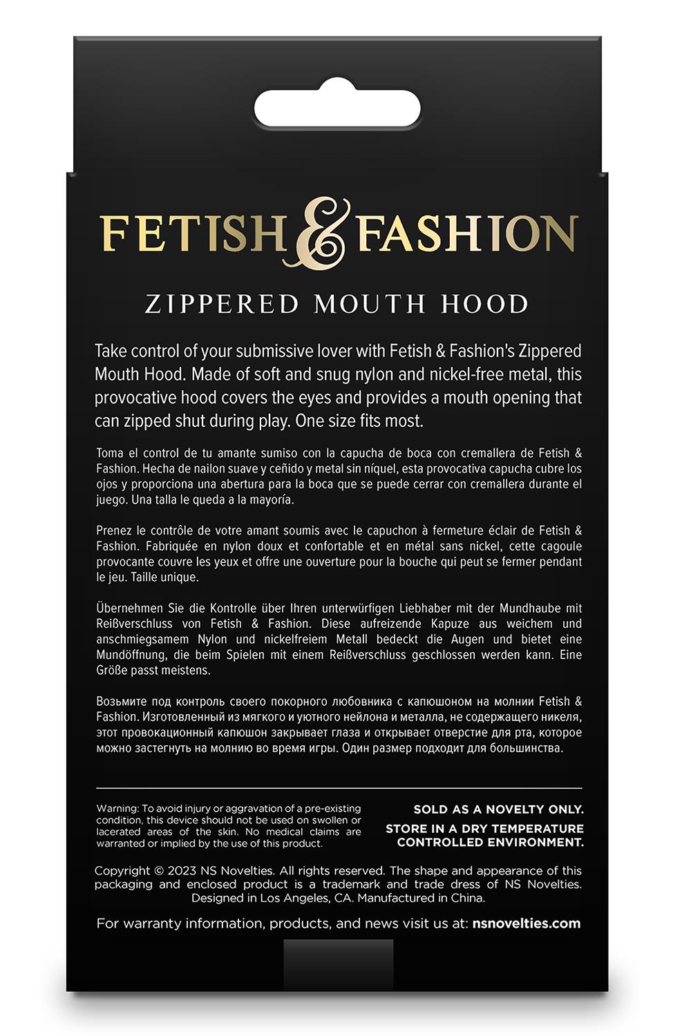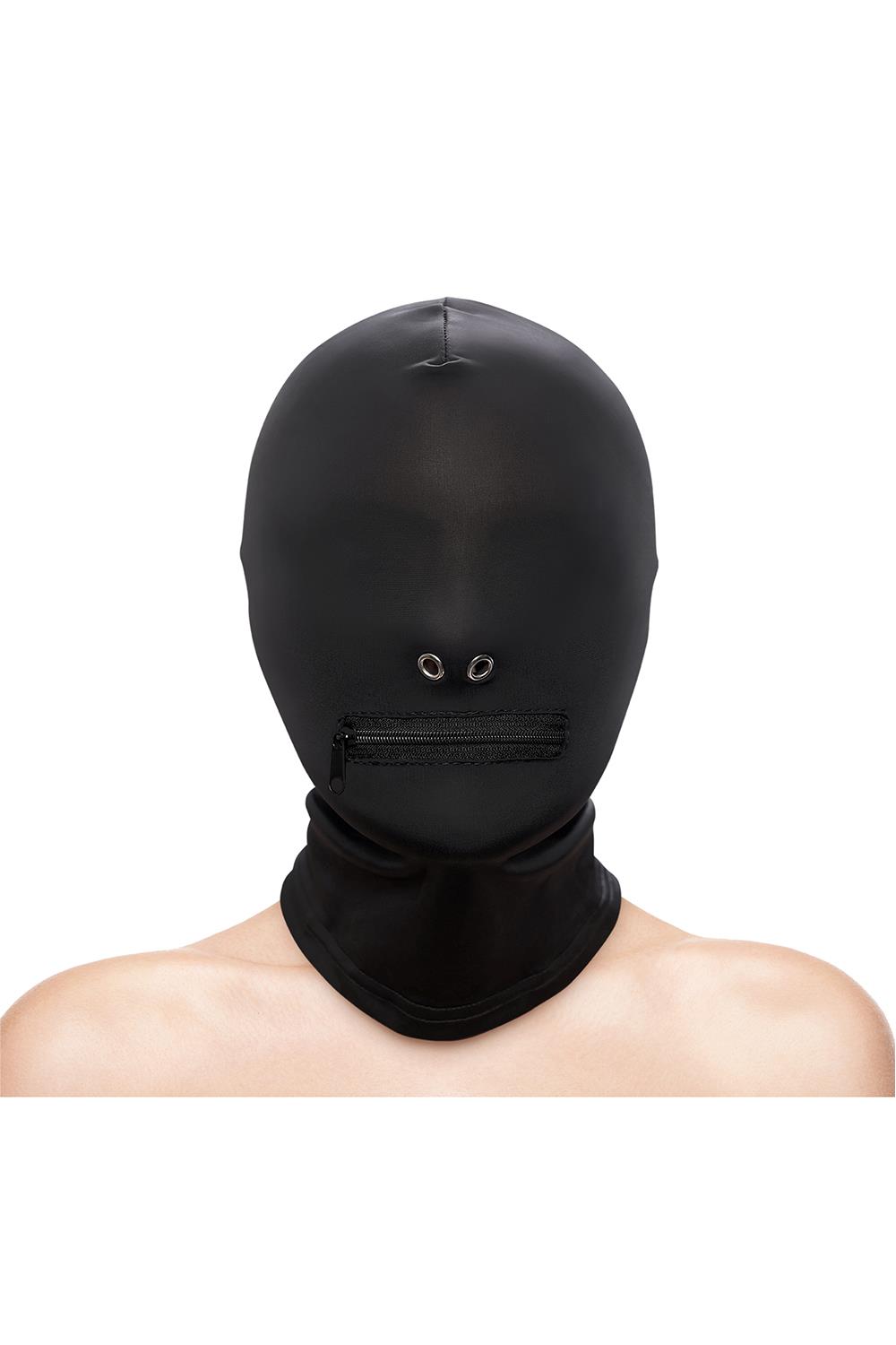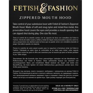 Take control of your submissive lover with Fetish & Fashion’s Zippered Mouth Hood. Made of soft and snug nylon and nickel-free metal, this provocative hood covers the eyes and provides a mouth opening that can zipped shut during play. One size fits most.