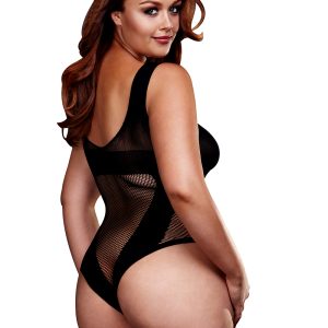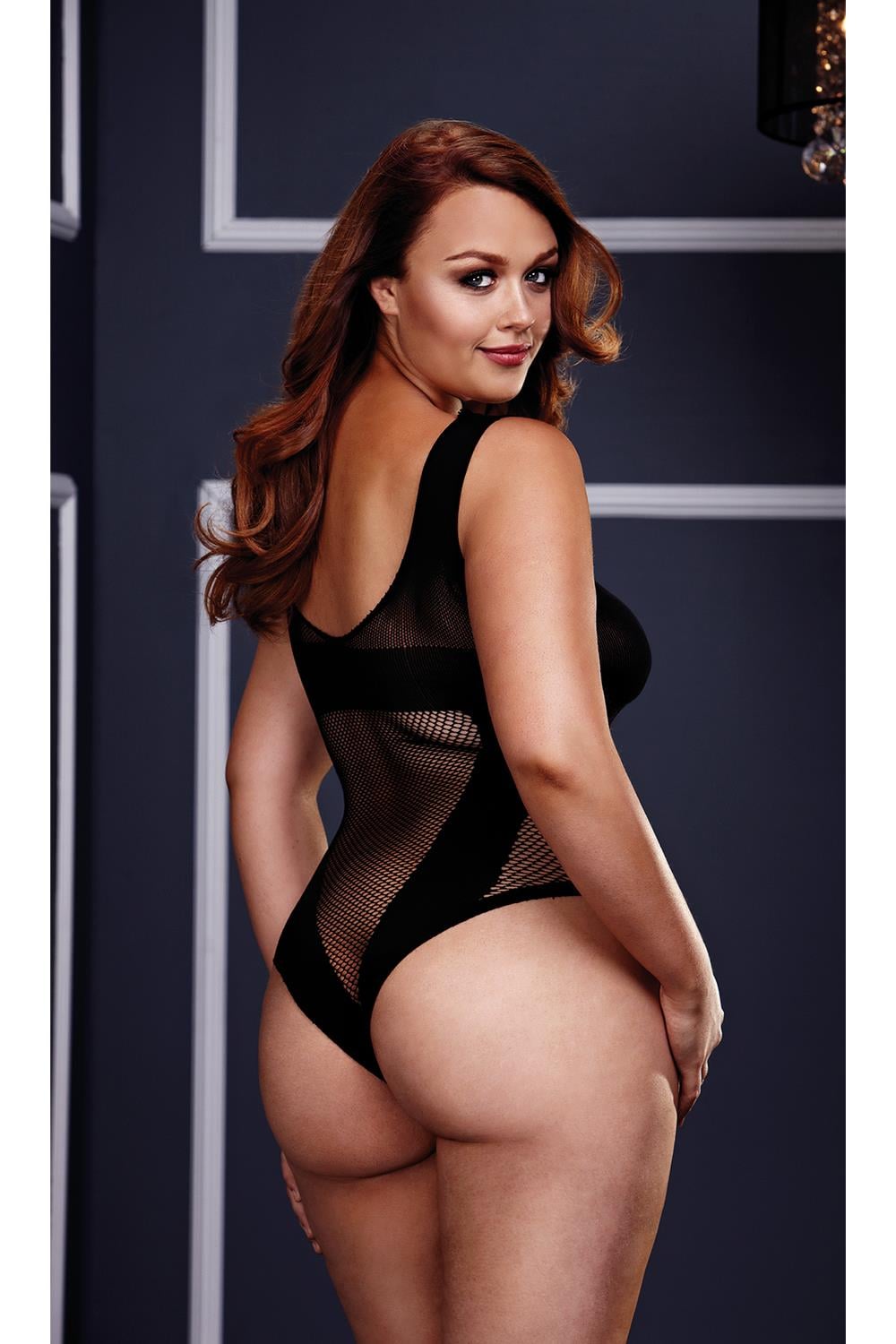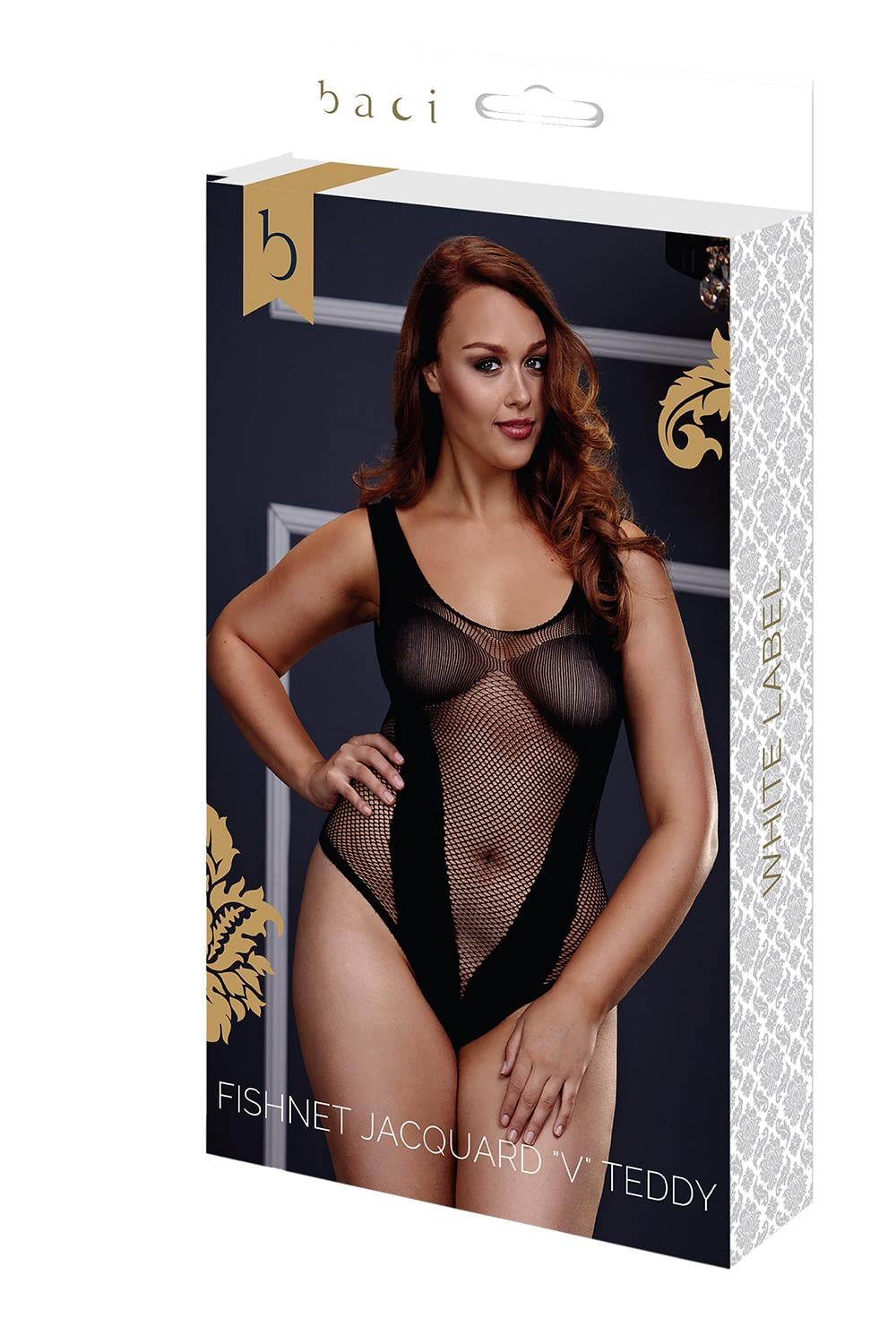This fishnet jacquard v teddy is the ultimate in sexy. Featuring high-cut hips and a low scoop neck, the V of this only adds to the sensuality you’ll feel when you slip into it.This bodysuit is completely sheer besides a strategically placed satin „V’ shape that covers your most intimate areas.Click here for the Baci Size Chart