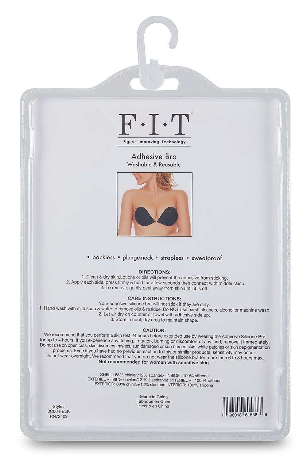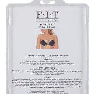 FIT (Figure Improving Technology) Cloth Adhesive Silicone Bra cup A, B, C or D, black, washable and reusable. Applicable for: BacklessPlunge-neckStraplessSweatproof Directions: Clean and dry skin. Lotions or oils will prevent the adhesive from sticking.Apply each side, press firmly and hold for a few seconds then connect with middle clasp.To remove, gently peel away from skin until it is off.Care Instructions: Your adhesive silicone bra will not stick if they are dirty.Hand wash with mild soap and water to remove oils and residue. Do not use harsh cleaners, alcohol or machine wash.Let air dry on counter or towel with adhesive side up.Store in cool, dry area to maintain shape.