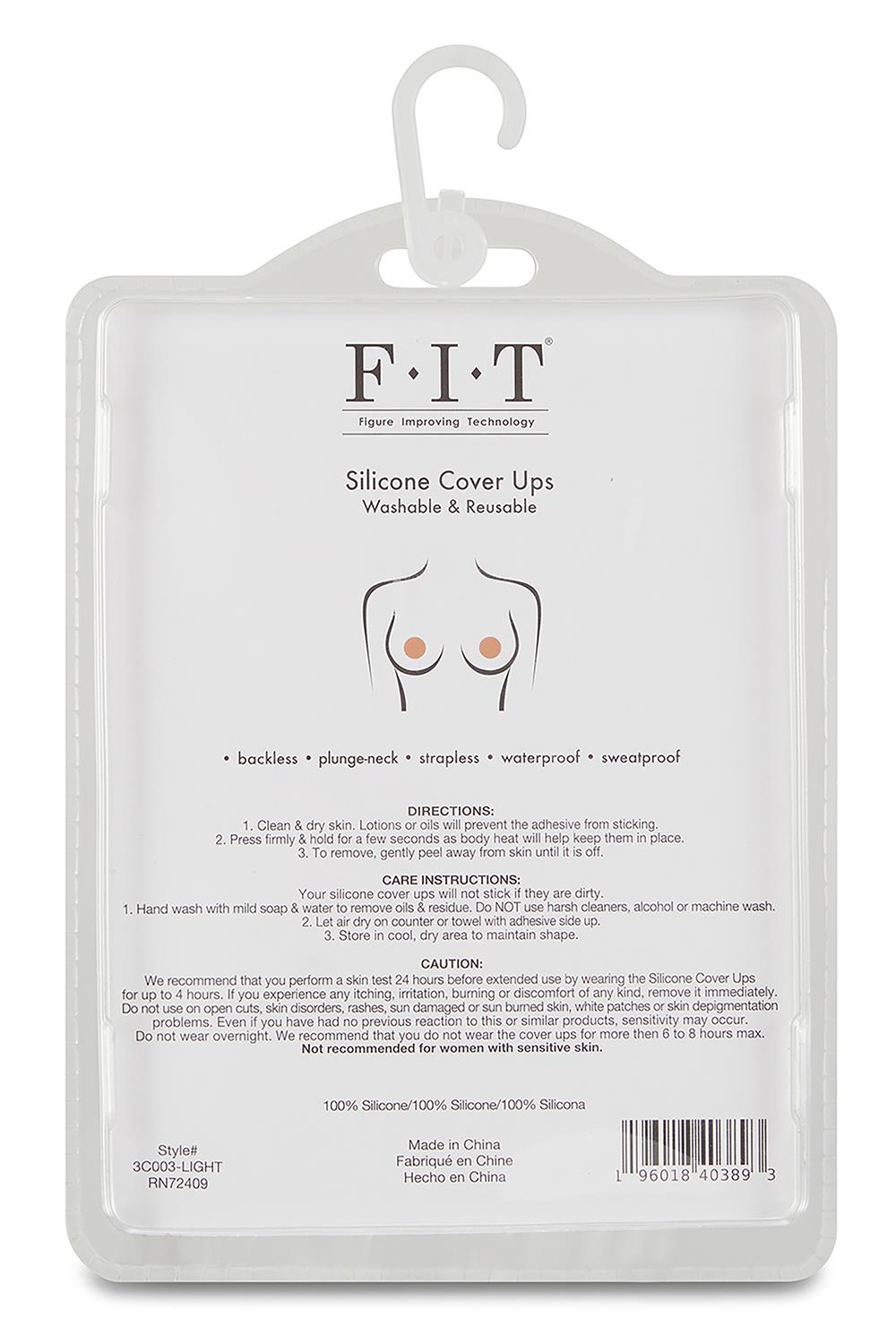 FIT (Figure Improving Technology) Adhesive Silicone Nipple Cover Ups, one size, washable and reusable. Applicable for: BacklessPlunge-neckStraplessSweatproof Directions: Clean and dry skin. Lotions or oils will prevent the adhesive from sticking.Apply each side, press firmly and hold for a few seconds then connect with middle clasp.To remove, gently peel away from skin until it is off.Care Instructions: Your adhesive silicone bra will not stick if they are dirty.Hand wash with mild soap and water to remove oils and residue. Do not use harsh cleaners, alcohol or machine wash.Let air dry on counter or towel with adhesive side up.Store in cool, dry area to maintain shape.