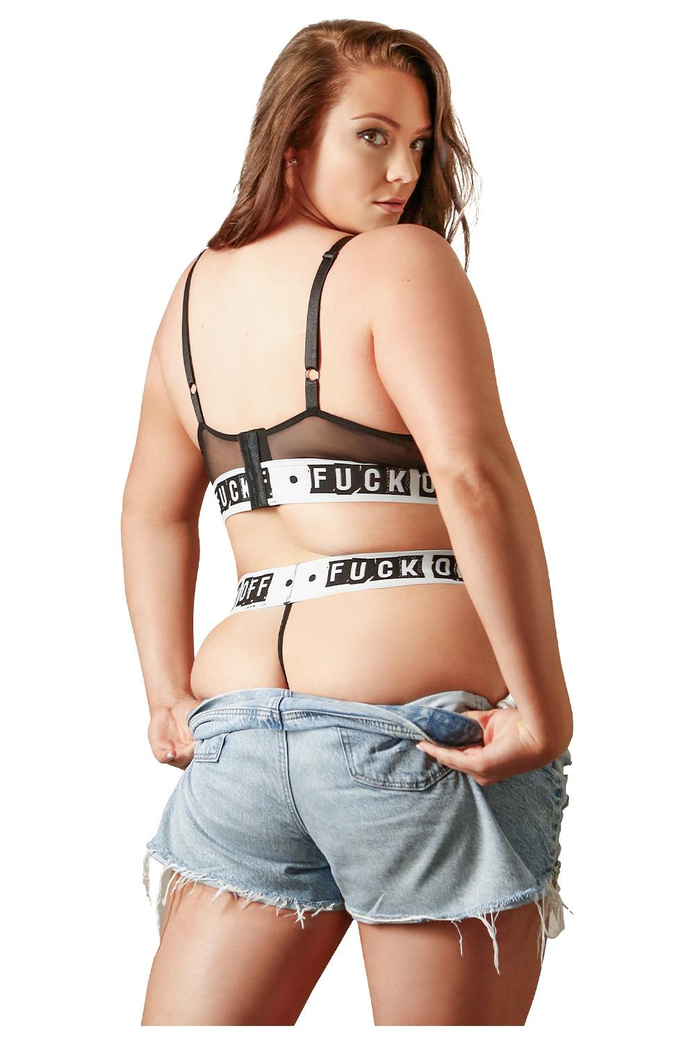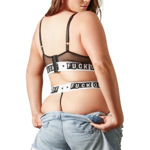 Mesh Longline Bra & Matching Thong Panty with „”Fuck Off”” ElasticFabric Content:95% Polyester, 5% SpandexUnderwire Longline BraAdjustable Shoulder StrapsSheer Mesh FabricMatching Thong PantyDownload Size Chart Fantasy Lingerie Vibes