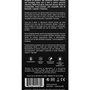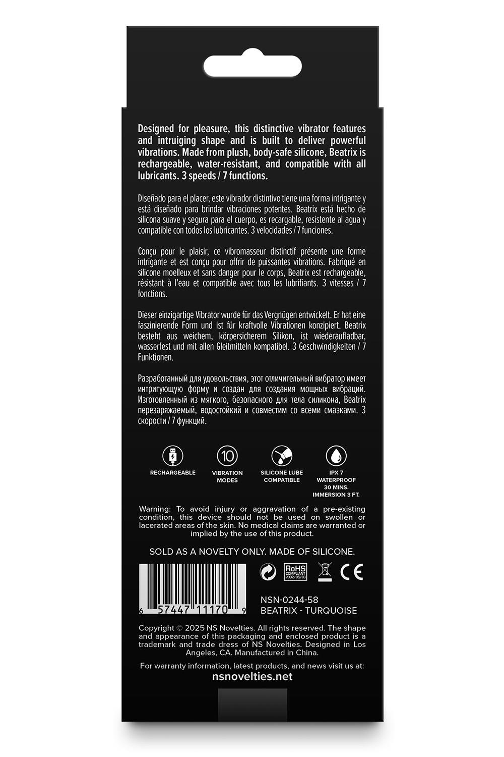 Designed for pleasure, this distinctive vibrator features and intruiging shape and is built to deliver powerful vibrations. Made from plush, body-safe silicone, Beatrix is rechargeable, water-resistant, and compatible with all lubricants. 3 speeds / 7 functionsRechargeableIPX Rating: IPX7