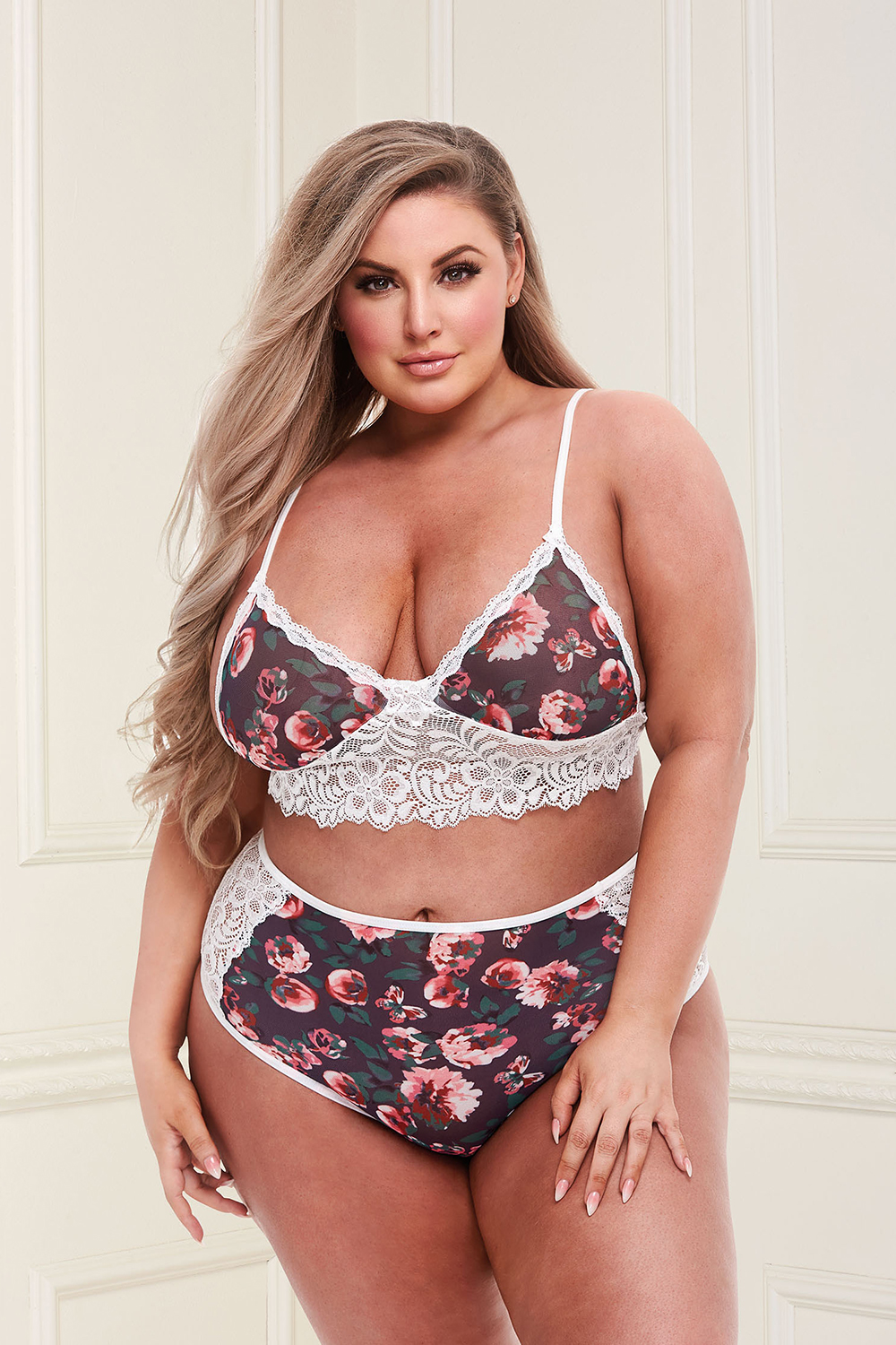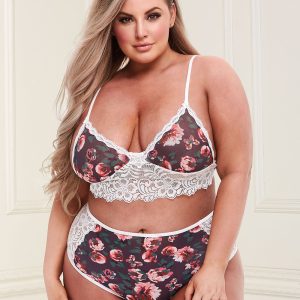 Bralette and high waist panty set with white lace and bright flowers on a grey background. The bra has adjustable shoulder straps and closes at the back. Vintage design meets today’s modern, sexy features in this stunning, dark floral two-piece set. The bralette features a slender strapped design with a wide band of contrasting white lace, while the matching high-waisted and cheeky panties feature matching panels of delicate lace.Fabric: 90% Polyester, 10% Spandex