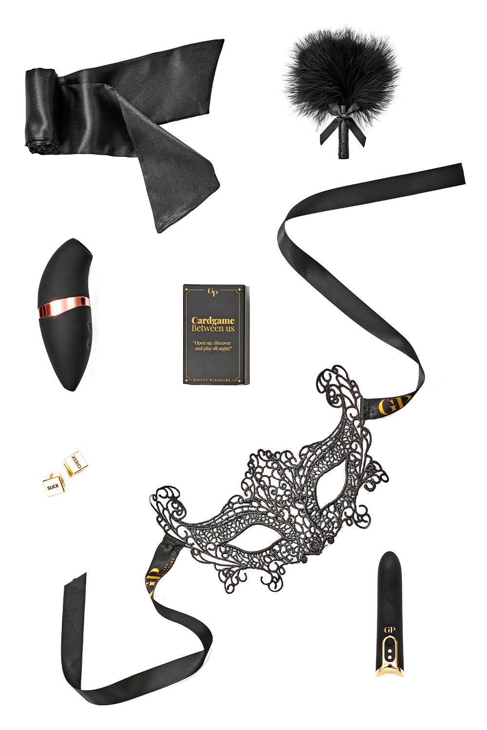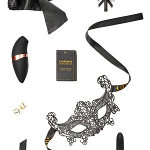 Satisfyer vibrator for versatile stimulationSleek bullet vibrator for focused pleasureLace eye mask to enhance mystery and anticipationFeather tickler for gentle teasingTwo soft bondage ribbons for creative restraintDice for spontaneous funBetween Us card game to spark connection and new discoveries This gift set offers a luxurious mix of pleasure, play, and sensual surrender. Perfect for adventurous couples who want to expand their intimate journey.