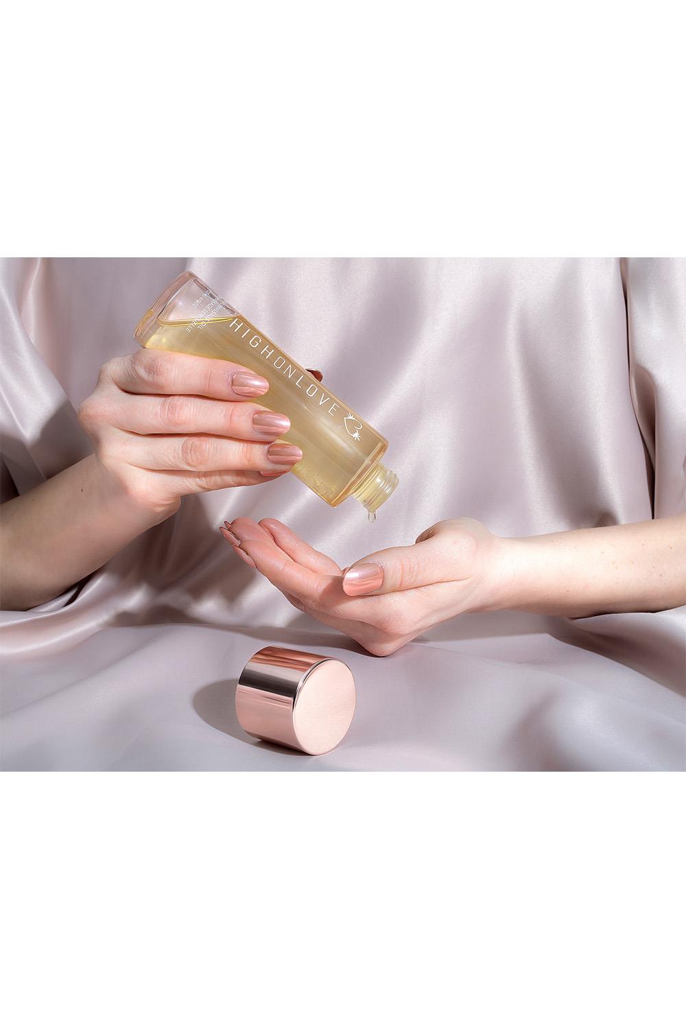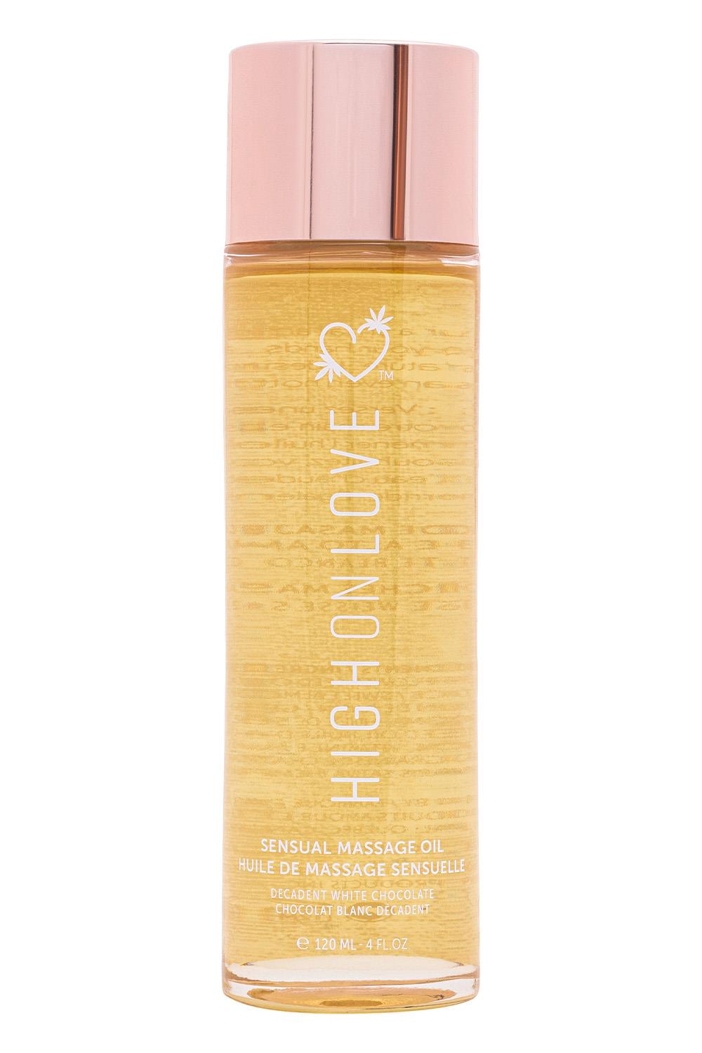 Decadent White Chocolate Sensual Massage Oil Revolutionizing the future of foreplay, this delectable blend of selected all natural oils with premium quality hemp seed oil nourishes the skin while simultaneously bringing harmony to the body and soul. This alluring oil has the ability to ease tension, increase energy flow and stimulate circulation, leaving your skin to feel velvety smooth. HighOnLove® Sensual Massage Oil glides heavenly to the touch and brings a whole new meaning to romance. 100% natural. Made in small batches to guarantee the highest quality.How to use: Warm a small amount between hands prior to skin application. If desired, heat the oil bottle in hot water for a warmer feeling to the touch. This oil is edible.FAQ: Can I use HighOnLove® Sensual Massage Oil as a lubricant?Yes. If you’re anything like us, a steamy massage can quickly escalate. Luckily, the natural aromas and high-quality oils in this product are entirely safe for your intimate zones.Ingredients: