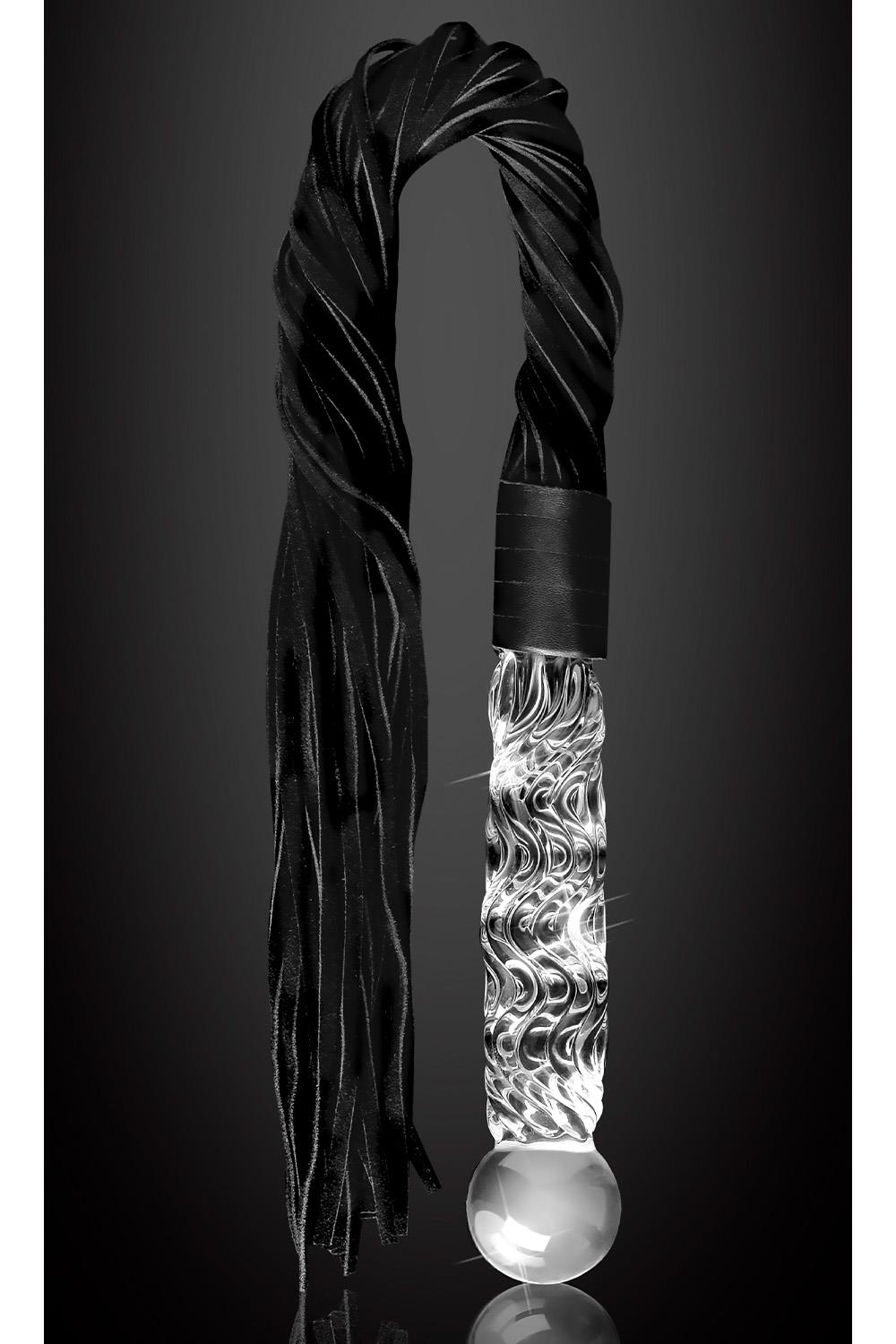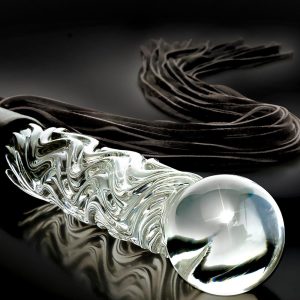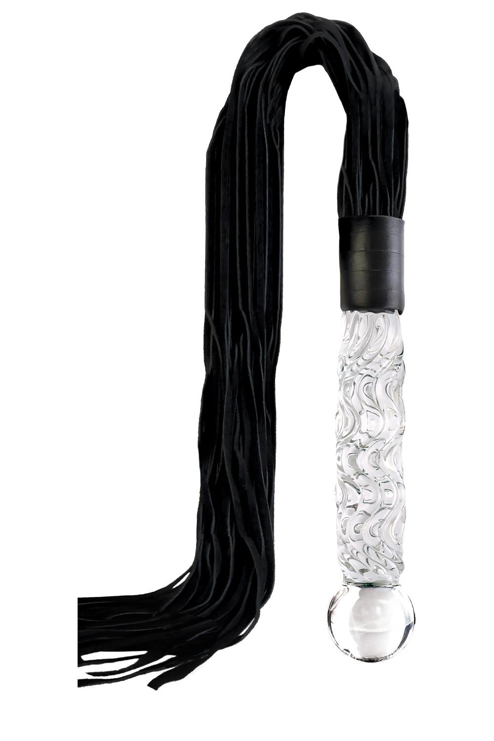 The glass Cat-O-Nine Tails features genuine bull leather tresses that are soft enough for beginner play but heavy enough to deliver a firm whack! The heavy-duty weighted glass handle is hand-blown and doubles as a glass dildo for vaginal or anal play. The beautiful textured swirls provide added stimulation, and the glass handle can be heated or cooled for tempting temperature play. Both practical and stylish, this gorgeous glass flogger is the perfect addition to any glass or fetish collection.