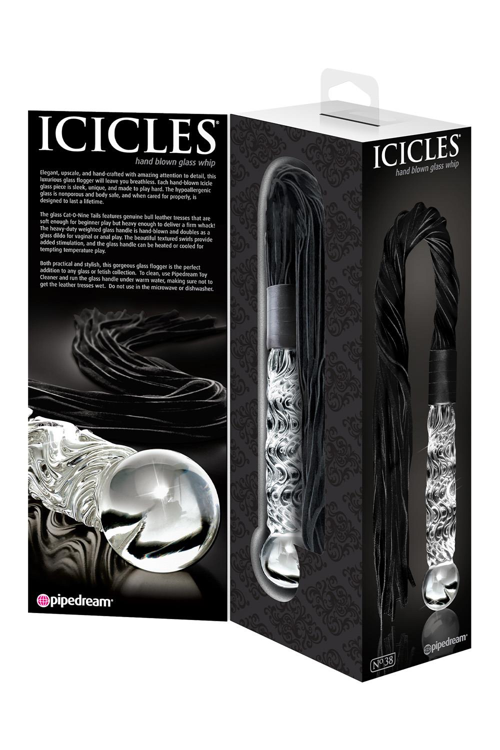 Elegant, upscale, and hand-crafted with amazing attention to detail, this luxurious glass flogger No.38 will leave you breathless. Each hand-blown Icicle glass piece is sleek, unique, and made to play hard. The hypoallergenic glass is nonporous and body safe, and when cared for properly, is designed to last a lifetime.