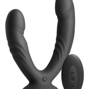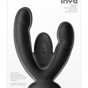 INYA Duet is a vibrating double dildo designed for solo indulgence or shared intimacy. Made of smooth, body-safe silicone, Duet features a strong suction cup base and a splash-resistant remote control for hands-free pleasure. Rechargeable. Water resistant. Compatible with all lubricants. 3 speeds / 7 functions. CR2032 (1) for remote included.Vibrating double dildoWireless remote control3 Vibration speeds / 7 functionsRechargeable vibratorRemote contains a CR2032 batteryWater resistantCompatible with all lubricantsProduct Dimensions:Vibe: 6.61 x 5.04 x 2.64 inch / 16,8 x 12,8 x 6,7 cmRemote: 2.56 x 1.38 x 0.63 inch / 6,5 x 3,5 x 1,6 cmInsertable Dimensions:S1: 5.51 x 1.3 inch / 14,0 x 3,3 cmS2: 4.41 x 1.26 inch / 11,2 x 3,2 cmProduct Material: SiliconeCharger type: USB-PinCharge time: 120 minutesRun time: 75 minutes