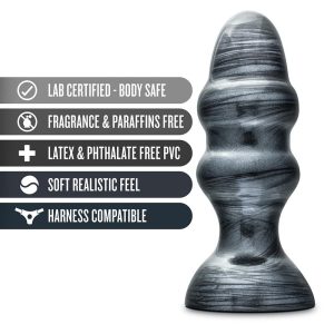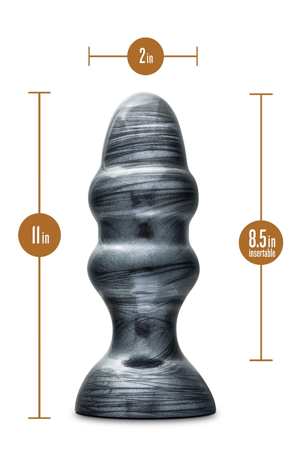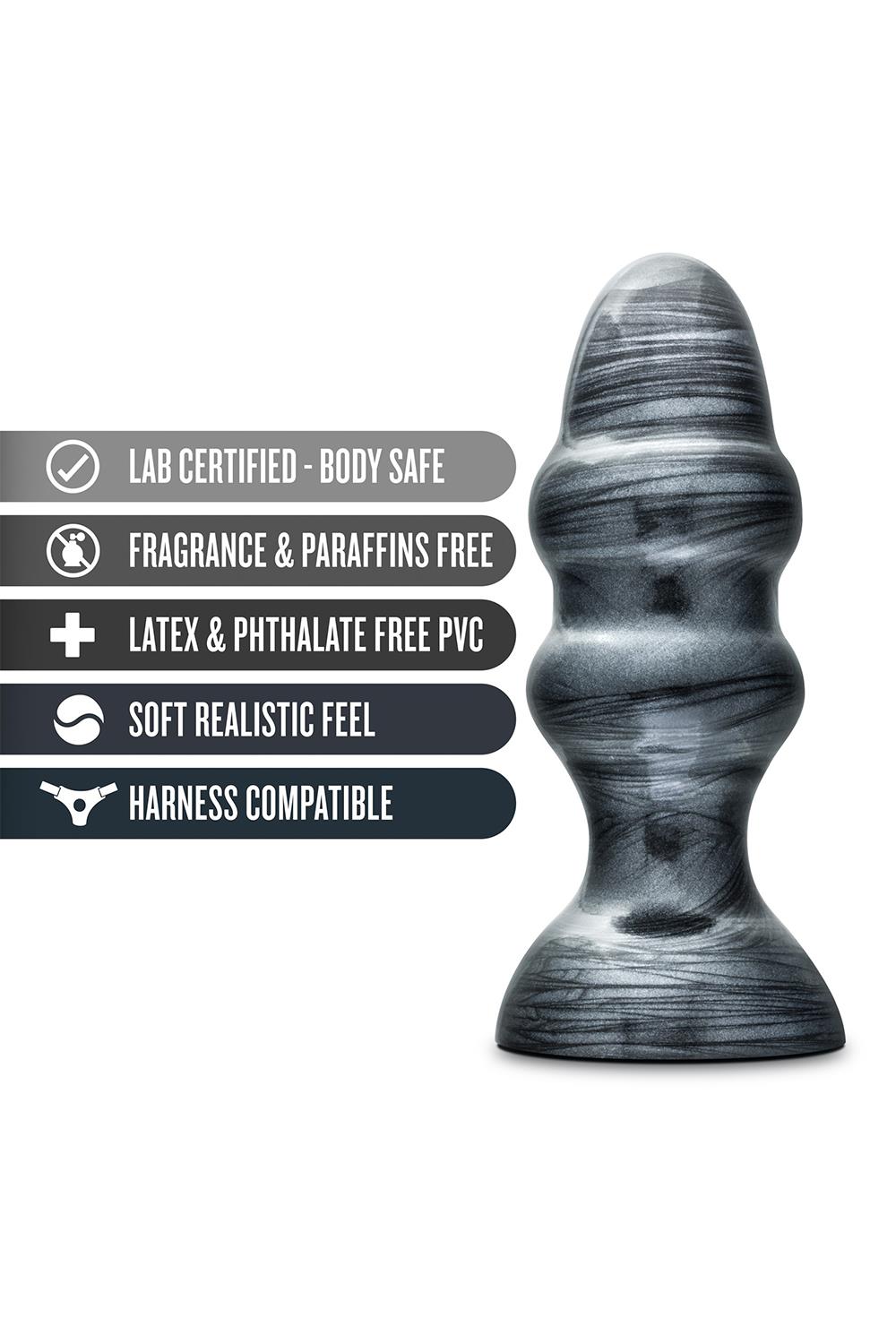 Jet’s latest and greatest. The Stealth is a Pro sized butt plug that looks sleek and menacing with a Jet Black Carbon Metallic Finish is made from lab tested body safe non porous PVC. Play Hard. Play Safe. This anal plug is for the advanced user. Soft, flexible and it’s tapered shape allows for easy and comfortable insertion. The sturdy suction cup base sticks on any smooth flat surface and prevents “overinsertion”. Wash with soap and water before and after each use. Pat dry with a clean dry cloth.Tapered shape goes in (relatively…) easy and stays inSturdy flared base prevents 'overinsertion’Hygienic: Made from Non porous PVC, will not harbor bacteriaSized to fill the needs of the most demanding size queensLength 6.5 inch / 16,5 cmInsertable length 5 inch / 12,7 cmWidth 2.25 inch / 5,7 cm