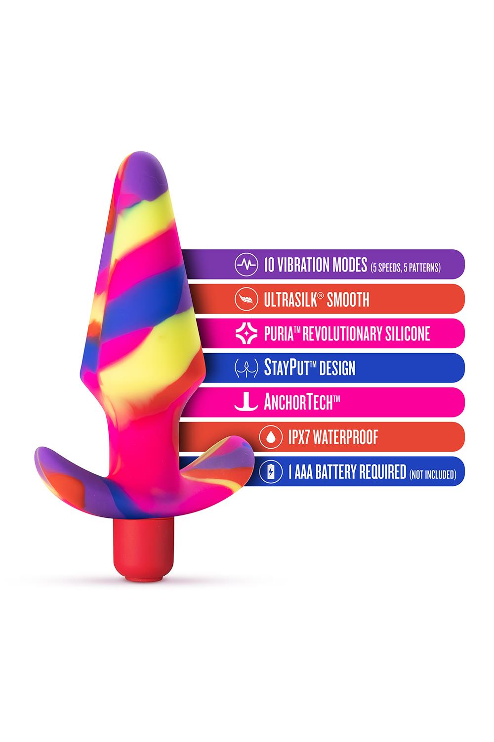 Podstawa AnchorTech™ sprawia, że zatyczka jest wygodna podczas długotrwałego noszenia! Wymaga 1 baterii AAA, brak w zestawie. 10 Przemyślanie zaprojektowanych trybów wibracji 5 prędkości, 5 unikalnych wzorów