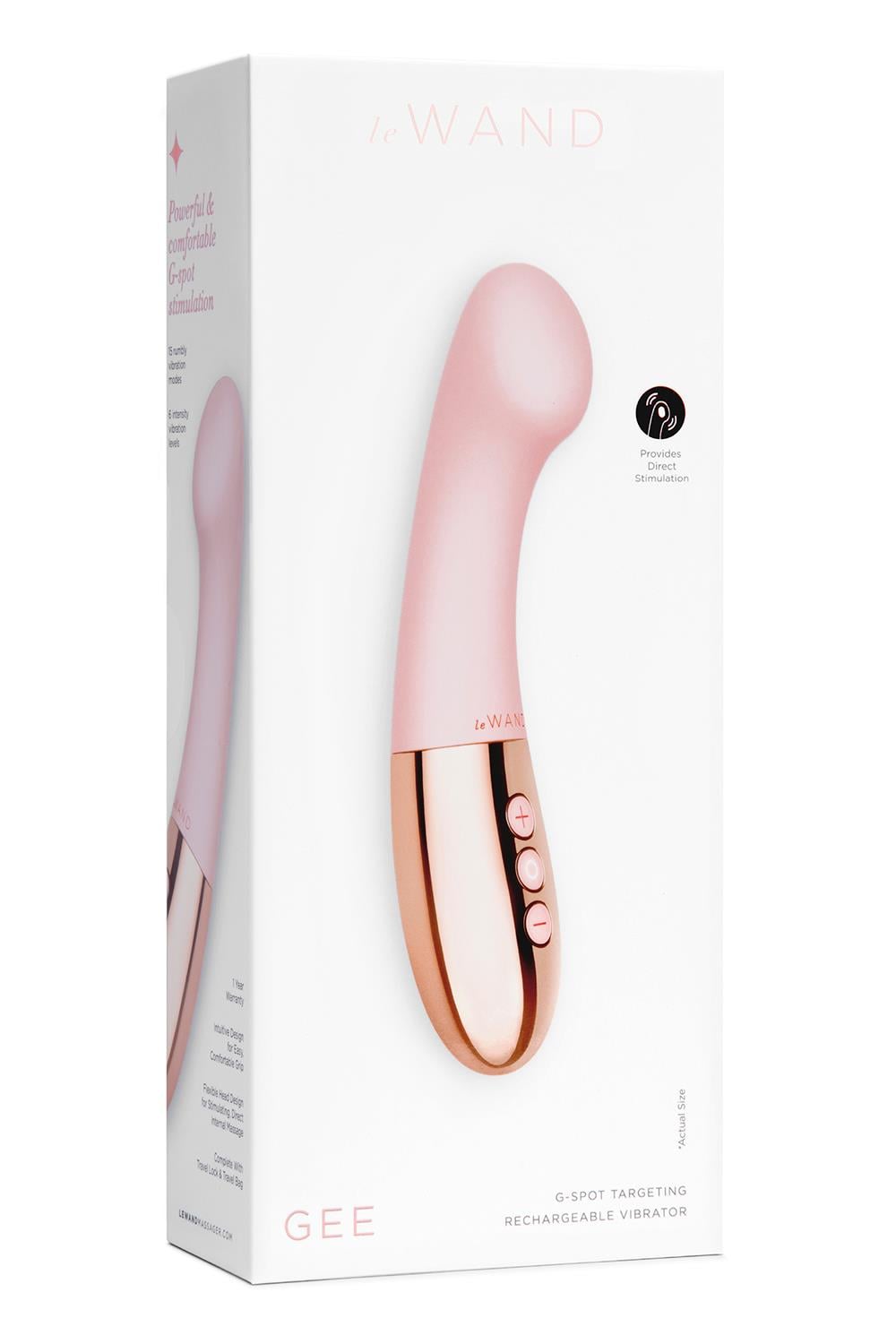 for discreet storage.Complete set includes:Le Wand GeeGuide to Chrome CollectionMicro-Suede Travel PouchUser GuideUSB Charging CordMaterial: Body-safe metal & siliconeSize: 5,4 (L) x 16, 6 (H) x 3,6 (D) cmWeight: 205 gBattery: 860 mAhCharging:2 hoursUse Tme: 2 hoursInterface:3 button, manual control15 Vibration modes6 Intensity levelsWhisper quietBody safeTravel lockShower-friendlyRechargeableHaving G-spot orgasms has never been easier! Meet the Le Wand Gee, a G-spot targeting rechargeable vibrator that removes all the guesswork by delivering deeply satisfying sensations.Perfectly curved with a signature flattened tip to hit the elusive G-spot, the Le Wand Gee features a flexible neck design for fully controllable stimulation. Use the Gee’s powerful vibrations for intense squirting orgasms or as an addition to partnered play.Slim, smooth, and easy to use, the Le Wand Gee is the ultimate sex toy for G-spot pleasureChrome CollectionChrome is a collection of vibrators that are powerful,