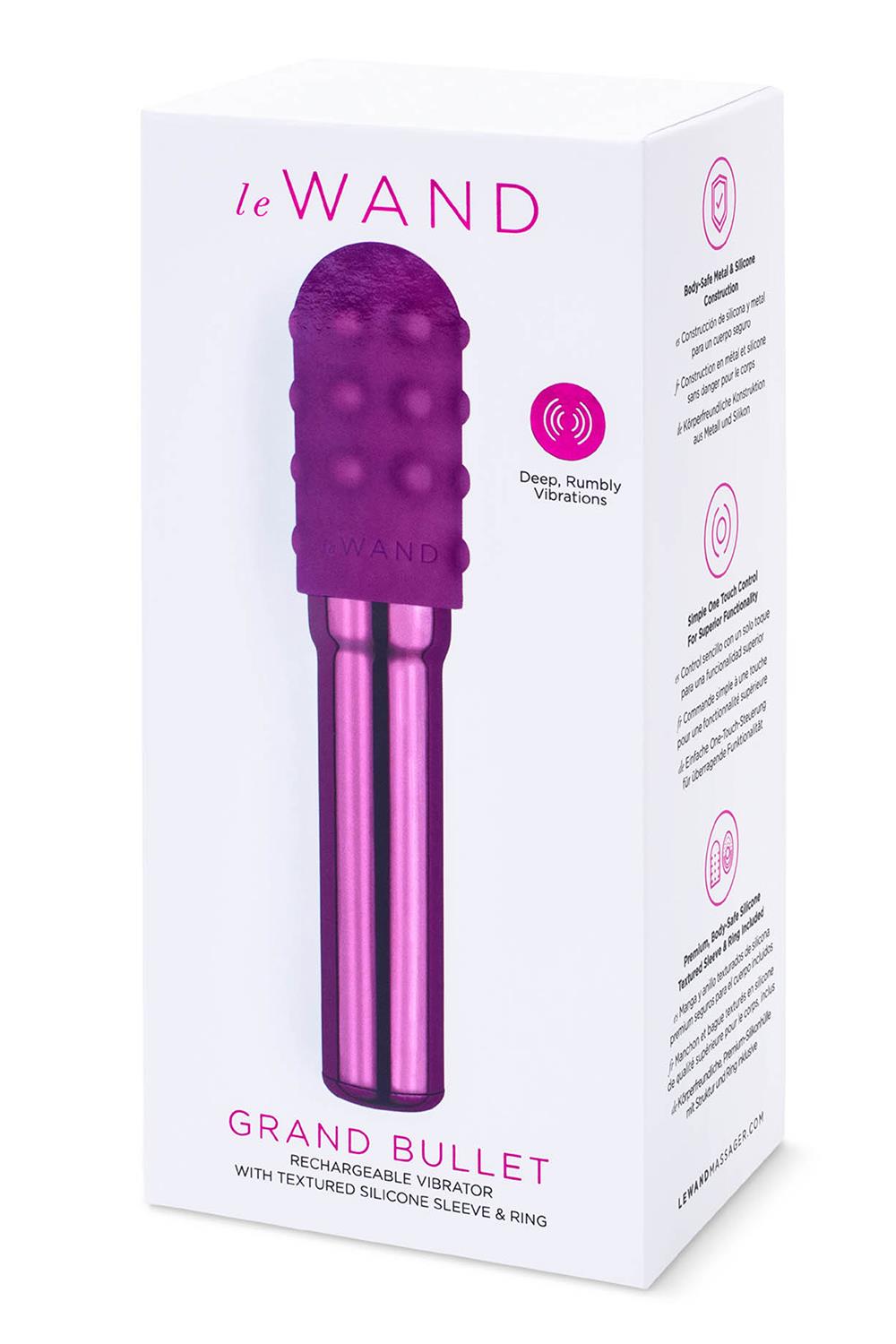 Grand Bullet is its tube-like structure that tapers outward at the top, giving the toy a handle for those needing a more secure grip. The Grand Bullet also packs 40% more power than its smaller counterpart for advanced players that want a stronger touch when they climax. The Grand Bullet is body-safe, USB rechargeable, and comes with a removable textured silicone sleeve for added pleasure.Complete set includes:Le Wand Grand BulletTextured Silicone SleeveTextured Silicone RingMicro-Suede Travel PouchUser GuideUSB Charging CordMaterials: Body-safe metal & siliconeSize: 12,4 (H) x 2,75 (D) cmWeight: 0.31 lbs / 140 gBattery: 300 mAhCharging Time: 2 hoursUse Time: 1 hourInterface: Single buttonIntensity Levels: 4Vibration Modes: 11Need a trusty vibe that never fails to deliver? Meet the Le Wand Grand Bullet — A supersized and significantly more intense version of our beginner-friendly bullet vibe from the Le Wand Chrome Collection.Packing 40% more power than its shorter sister, the Grand Bullet features a tube-like structure that tapers outward at the top, giving the toy a comfier handle for those needing a secure grip. Experiment with the two removable silicone sleeves for internal and external pleasure beyond measure!Made from body-safe metal that treasures temperature play, both Le Wand Bullet and Grand Bullet are waterproof pros for those of us wishing to embark on an orgasmic aquatic adventure. Use the bullet vibes to stimulate the clit or vulva, experience nipple orgasms, or nuzzle the shaft and head of the penis.Offering a whopping 11 vibration modes with 4 intensity levels, the Grand Bullet is a travel-friendly rechargeable vibe that was born to deliver endless satisfaction. Chrome CollectionChrome is a collection of vibrators that are powerful, portable, and adaptable to a full range of situations. Use our Bullet vibe for an incredible quickie in your home office, the Deux as a toe-curling tool to fall asleep on restless nights, or go straight to the “Point” for mind blowing, rumbly ~oomph~ during partnered sex. Our mini vibrators might seem simple, but the power and thoughtful design of the Chrome Collection allows each of the products to serve multiple different functions for everyone — from vibrator novices to advanced level pleasure-seekers.Is Le Wand Grand Bullet waterproof?It is waterproof with an IPX 7 rating and safe to be submerged in water up to 3 feet for less than 30 minutes. You can use it in your bath – just keep your eye on the time!How should I clean Le Wand Grand Bullet?Use a mild antibacterial soap and warm water, or a sex toy cleaner directly on the toy. Rinse the toy well and allow it to air dry or pat dry.How should I store my Le Wand Grand Bullet?After cleaning, allow Le Wand Grand Bullet to air dry. Then, put it into the storage pouch included with the toy and tuck it in your drawer/box of treasures.Is Le Wand Grand Bullet intended for external or internal use?Le Wand Grand Bullet is designed to be enjoyed inside or outside the body. Do not use it for anal penetration.About le WandLe Wand is a woman-founded premium brand of personal vibrating massagers that bring unparalleled quality to a notoriously sketchy industry. Le Wand originated as one hell of a classic wand (all the power you could want with award-winning design to match) and has now a become a full line of best-in-class, heart-pounding,