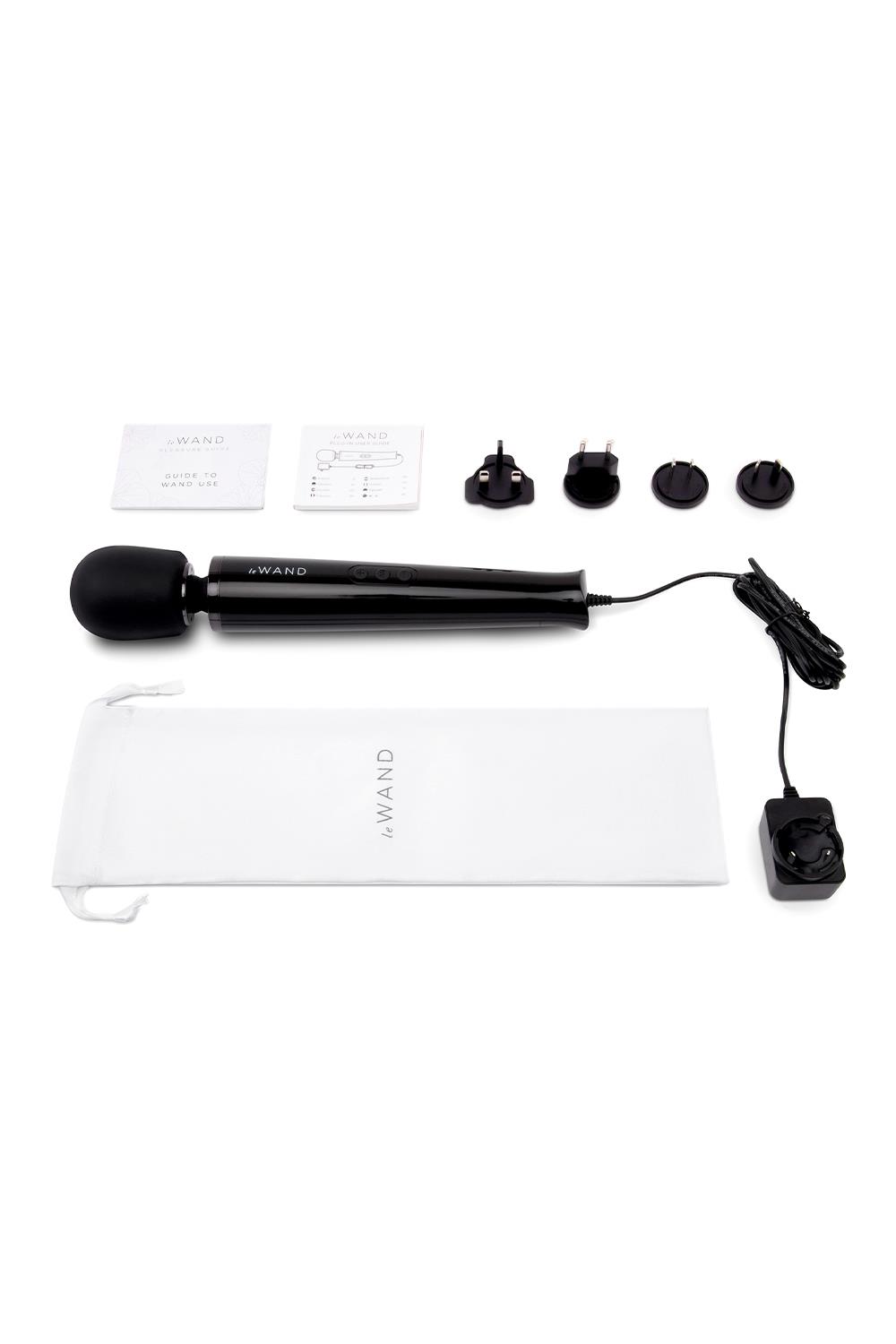 Le Wand Plug-In is a best-in-class, classic style vibrating massager that features unparalleled quality with an award-winning design to match. This globally compatible A/C powered vibe features 10 distinctive, rumbly vibration speeds and 6 vibration patterns. The sleek soft-touch handle and extra-long 8’ cord make it easy to hold and navigate in multiple angles while the flexible neck bends for positioning and pleasure. Designed with pleasure in mind for all bodies, Le Wand embraces and champions intimacy for all with this powerful, versatile pleasure tool that insists on bringing you to the next level.Made from 100% body-safe silicone10 Ultra-powerful vibration intensities6 Vibration patternsPower cord 2,4 metersFlexible neckComes with a travel lockIncludes convenient travel case and pleasure guideLuxurious packaging for giftingMaterials: Body-safe silicone & ABSSize: 34,0 (H) x 6,2 (D) cmDiameter: 6,21 cm / 2.45 inchNeck diameter: 5,0 cm / 1.97 inchCircumference: 19,5 cm / 7.69 inchWeight: 1.29 lbs / 585 gUse Time: UnlimitedMax noise level: < 68 dBInterface: 3 button controlIntensity levels: 10Vibration modes: 6Adapter Voltage output = 5V / 2AMotor RPM No loading = 8,000RPM + / - 10% ("No loading” means the motor is tested without the counterweight, so the motor spins faster)Motor RPM Loaded = 7,600RPM + / - 10% ("Loaded" means the motor is tested with the counterweight, so the motor spins slower)Classic makes a comeback! We took our award-winning OG wand and added the perfect retro feature to enable our power hunters. Meet the Le Wand Plug-In Vibrating Massager.Ever had a sex toy die out during a steamy sesh? What a total buzzkill. That's where Le Wand Plug-In rules supreme. With its extra long 8-foot cord, simply plug-in & get ready to ride continuous waves of pleasure or use it with a partner for a beyond orgasmic combo of the ultimate rumbly vibes and penetration.Compatible with the OG silicone attachments & texture covers, the Le Wand Plug-In is designed with pleasure in mind for all bodies. Is Le Wand Plug-In Vibrating Massager waterproof?No, it is neither waterproof or splashproof. Do not use it in the shower or a bath.How should I clean Le Wand Plug-In Vibrating Massager?Use a damp cloth and mild antibacterial soap to wipe the toy down. Make sure the cloth removes all soap residue before you allow the toy to dry. You can also use a sex-toy cleaner directly on the area of use, and finish with a damp cloth.How should I store my Le Wand Plug-In Vibrating Massager?After cleaning, allow Le Wand Plug-In Vibrating Massager to air dry. Then, put it into the storage pouch included with the toy and tuck it in your drawer/box of treasures.Is Le Wand Plug-In Vibrating Massager intended for external or internal use?Le Wand Plug-In Vibrating Massager is designed to provide stimulation on the outside of the body. Check out our attachment collection to add texture to the vibration or convert it into an internal vibrator.About le WandLe Wand is a woman-founded premium brand of personal vibrating massagers that bring unparalleled quality to a notoriously sketchy industry. Le Wand originated as one hell of a classic wand (all the power you could want with award-winning design to match) and has now a become a full line of best-in-class, heart-pounding, hair-raising toys. Designed with pleasure in mind for all bodies, Le Wand embraces and champions intimacy for all, with powerful, versatile pleasure tools that insist on bringing you to the next level. We’re proud to be people’s go-to for orgasms they can count on — over and over again.