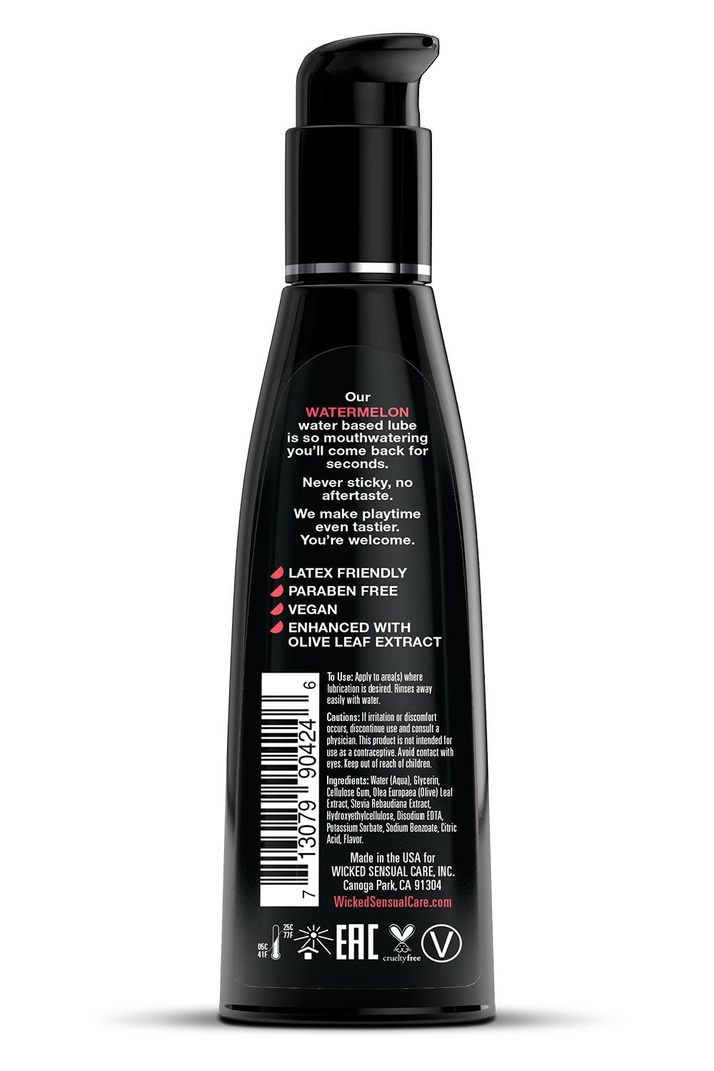 Wprowadź lato do swojego życia seksualnego! Całkowity, lizalny i pyszny, osobisty lubrykant Wicked Aqua Watermelon dodaje subtelnego i pysznego, naturalnego aromatu, aby zwiększyć przyjemności jamy ustnej. Lekka i jedwabista formuła na bazie wody stanowi idealne zmysłowe połączenie eleganckiego lubrykantu i doznań smakowych. Nigdy nie lepki i bez posmaku, Wicked Aqua Watermelon zaspokaja Twój apetyt na słodycze i intymne pragnienia w jednym niesamowitym produkcie. Seks oralny nigdy nie smakował tak dobrze.