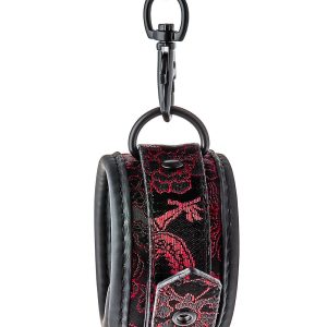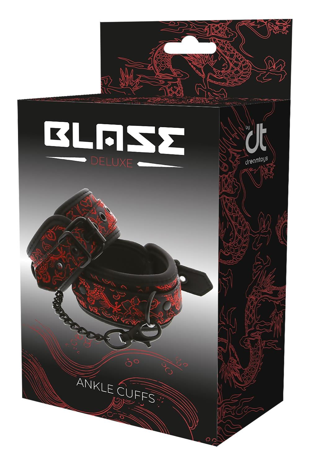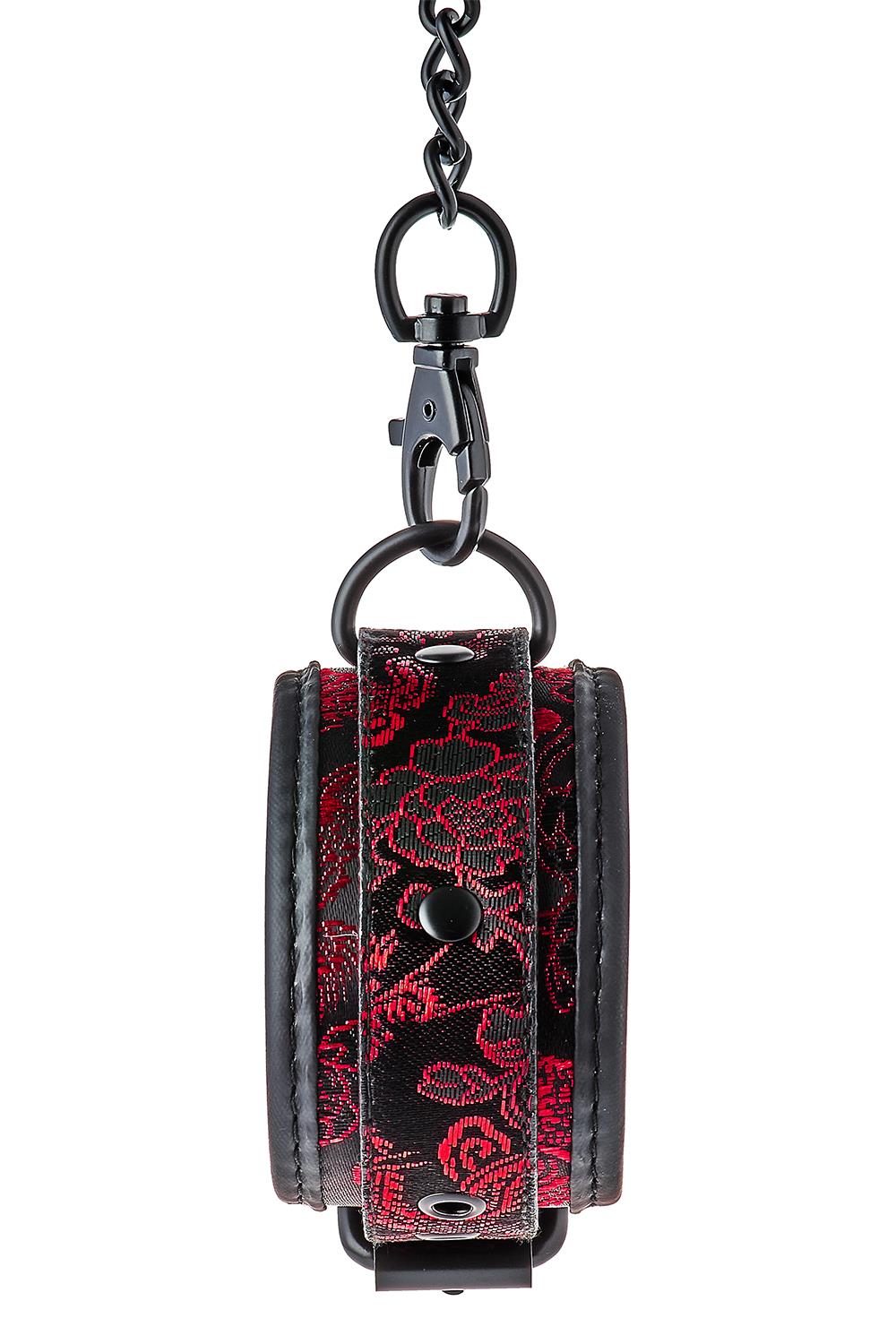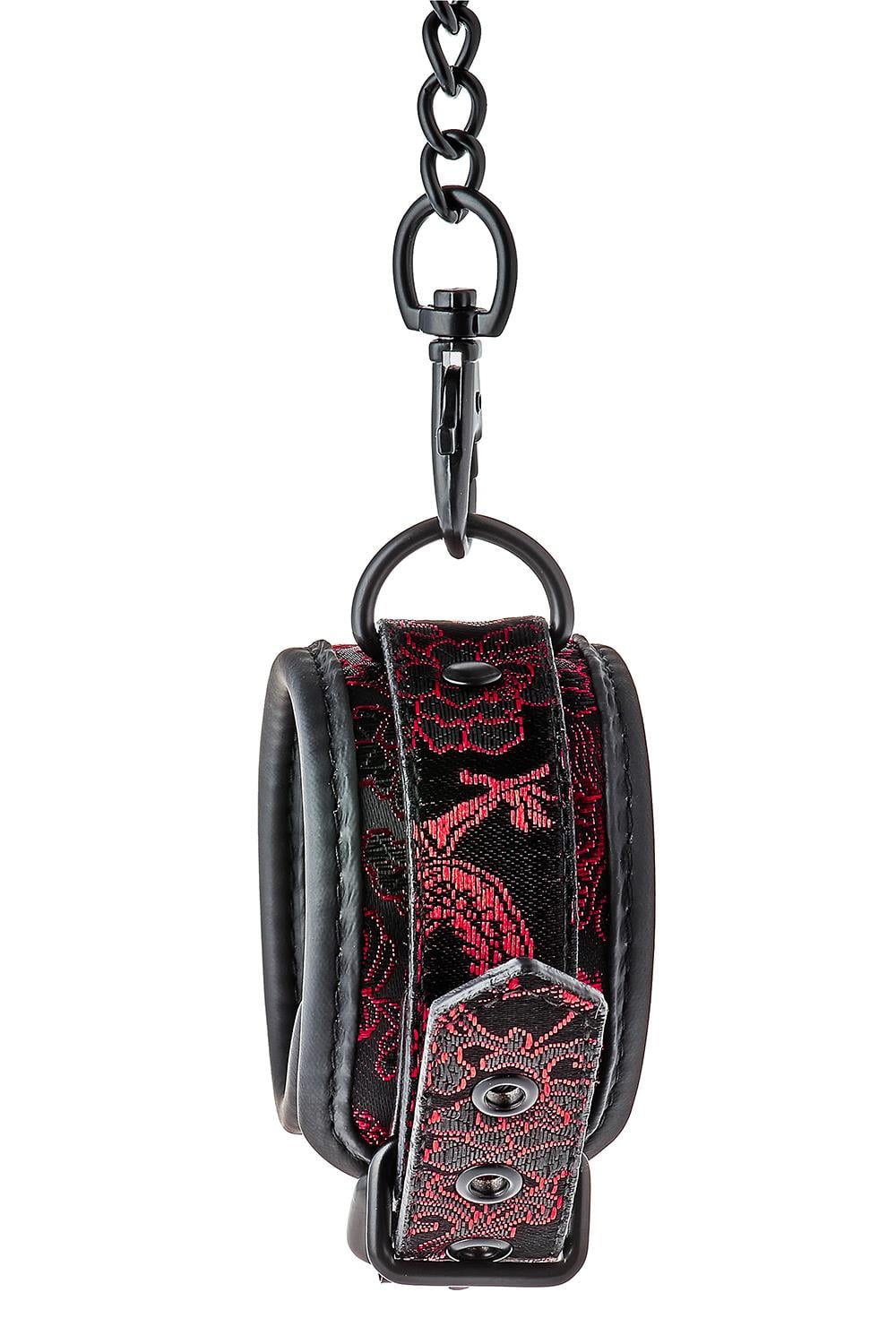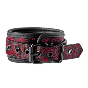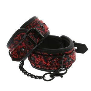 Para stylowych mankietów na kostkach z haftowaną dekoracją. Wszystkie mają czarny, wolny od niklu sprzęt i są wyłożone miękkim, ale wytrzymałym materiałem neoprenowym, co zapewnia seksowną i wygodną grę. Mankiety na kostkach są w pełni regulowane za pomocą prostych sprzączek w stylu paska. Łańcuszek o długości 12 cm utrzymuje razem mankiety. Łańcuszek jest odpinany z jednej strony za pomocą karabińczyka. Możliwe jest dołączenie większej ilości łańcuchów lub haków linowych lub dodatkowych obciążników.