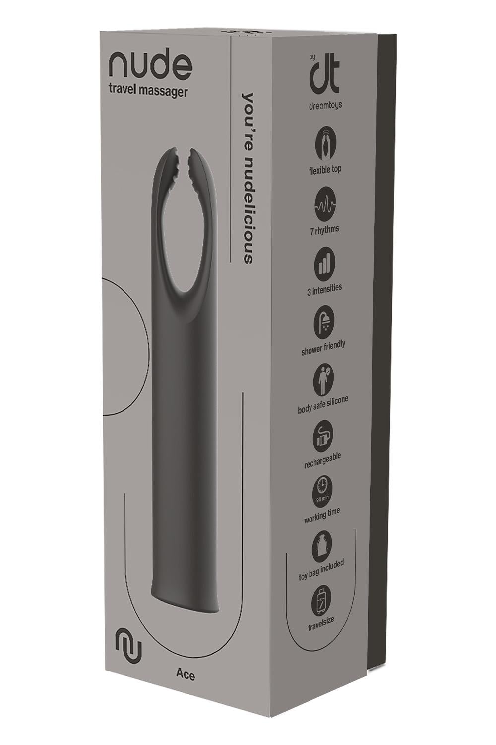 At Nude, we believe in the power of purity and quality. That’s why each and every one of our products is meticulously crafted to provide you with an experience that’s as natural as it gets. Say goodbye to anything less than extraordinary and unlock the true essence of pleasure with our clean and refined toys. Experience the pleasure revolution that’s sweeping the world – the Nude revolution. Our products are more than just toys they’re gateways to euphoria and liberation. Let’s get naked and unleash your most audacious fantasies with Nude’s premium range of sensual delights. It’s time to redefine pleasure, the Nude way.This travel sized Massager by Nude has single button operation to cycle through the 10 strong vibrations. It has 7 rhythms and 3 speeds. The soft and flexible wings make this massager perfect for beginners and for anyone who likes subtle and tantalizing stimulation. The Nude Massager Ace is made of smooth soft silicone and ABS, free of phthalates and body safe. Ace has an IPX6 rating for water resistance. For charging after use the vibrator has a waterproof charging hole. A USB pin cable is included. After a full charge your Nude vibe is ready for 90 minutes of nudelicous delight.Let’s get naked and discover the world of Nudelicious ecstasy!