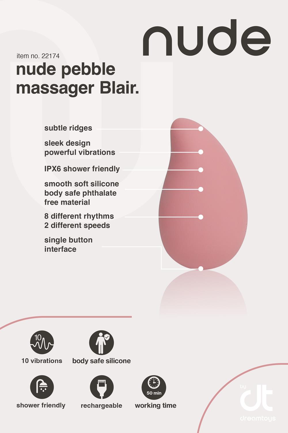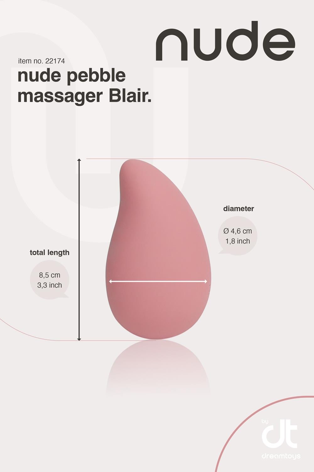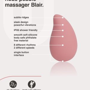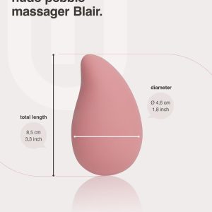 Ten masażer w kształcie kamyka firmy Nude wygląda uroczo i stylowo w delikatnym różowym kolorze i ma kilka zalet: Kształt został zaprojektowany tak, aby wygodnie mieścił się w dłoni, co ułatwia trzymanie i manewrowanie. Ta ergonomiczna konstrukcja zwiększa komfort użytkownika zarówno podczas samodzielnego masażu, jak i podczas stosowania przez partnera. Zaokrąglone i wyprofilowane krawędzie Blair w kształcie kamyka pozwalają na precyzyjne celowanie w określone mięśnie lub punkty ucisku.