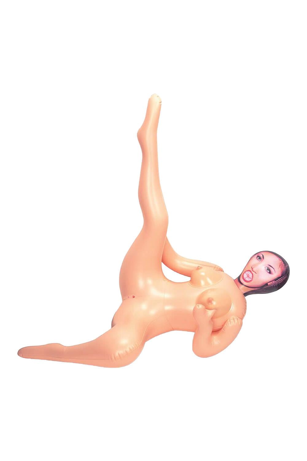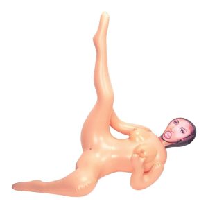 Nadmuchiwana lalka miłosna naturalnej wielkości, umieszczona z jedną nogą w powietrzu.